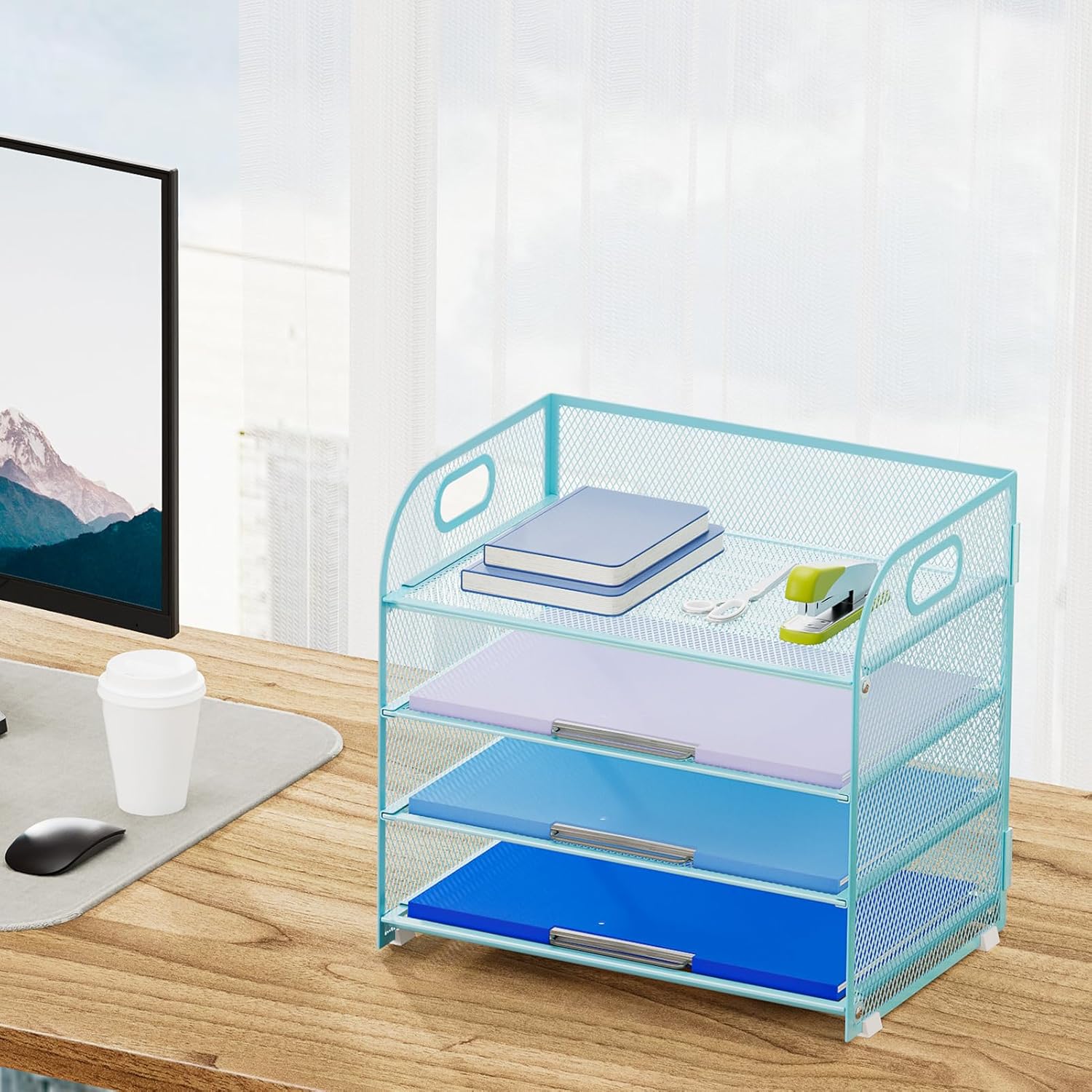 Marbrasse 4 Tier Paper Organizer Letter Tray - Mesh Desk File Organizer with Handle, Paper Sorter Organizer for Letter Office File Folder Holder (Blue, 12.6" x 9.1" x 10.7")