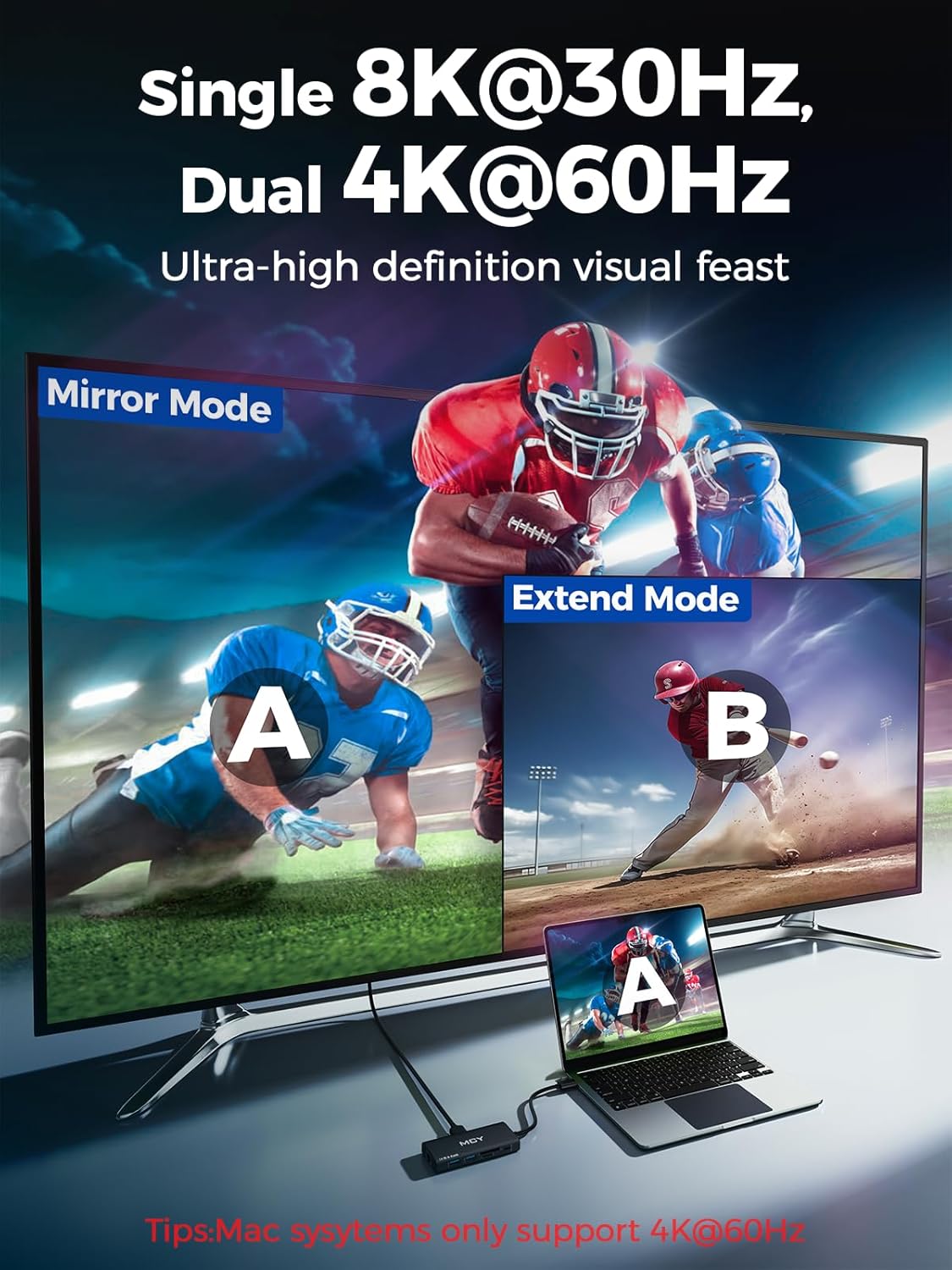 - 【Dual Display Ultra HD Output】The docking station dual hdmi supports single 8K, dual 4K@60Hz mirror/extend modes. Ideal USB C to HDMI adapter for MacBook/Windows laptops. Ultra clear images bring you a visual feast!(Note:1、HDMI1 8K requires DP1.4 protocol PC support (Mac systems only support 4K ). 2、For MAC, the display on both external monitors will be identical.)