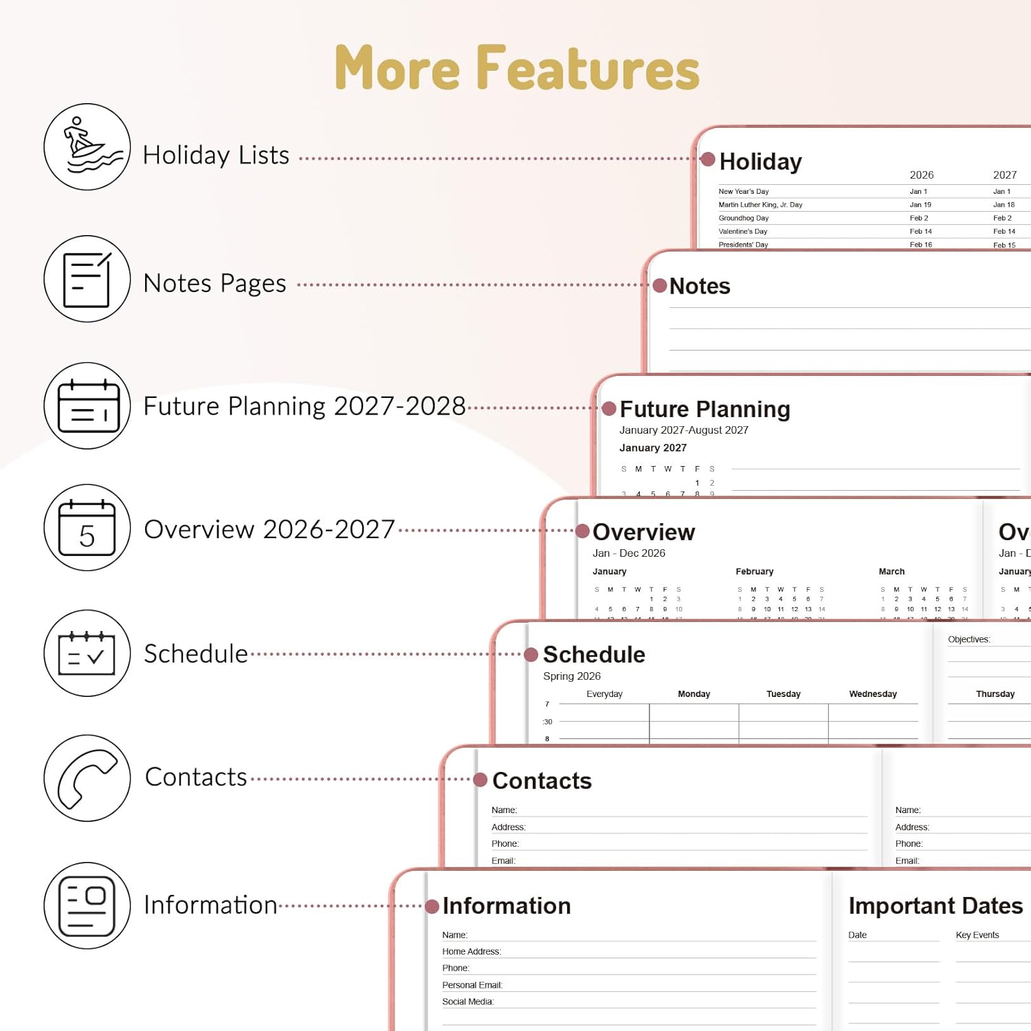 - Extra Feature Pages: The 2026 planner offers extensive planning pages—including personal info, important dates, contacts, schedules, a 2026-2027 overview, notes, and holidays. It's the perfect tool to inspire and organize your life, work, or studies, ideal for everyone from students to professionals