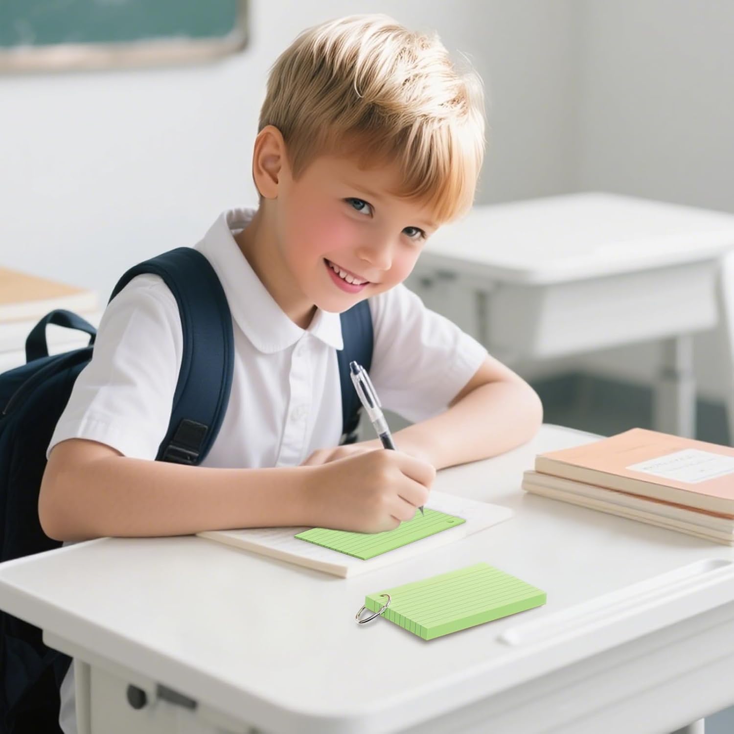 250 Count Green Index Cards 3x5 Inch with Key Ring, Color Flash Index Card (50 Sheets Each), Durable & Portable Note Taking for Students, Teachers, Study Note Cards for Office Home School