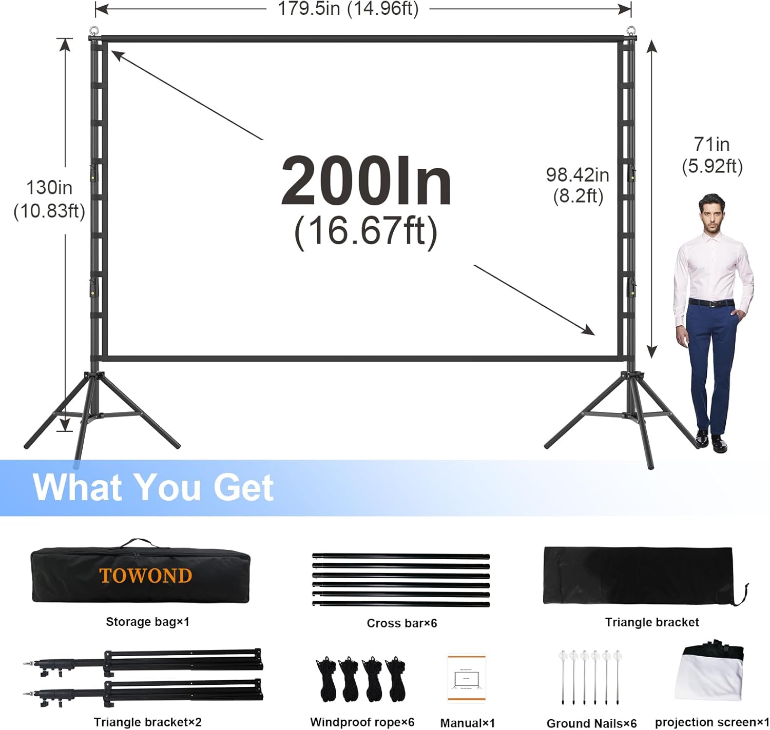- Bigger Screen, Better Experience: Engineered with thicker fabric than other projection screens, this 200 inch projector screen delivers theater-grade immersion with 16:9 aspect ratio, 14.95ft x 10.83ft projection area and 160° viewing angle. The washable, anti-crease fabric ensures perfect flatness, while dual-sided projection ensures vivid colors from any position. Perfect for outdoor movie nights and home theater.