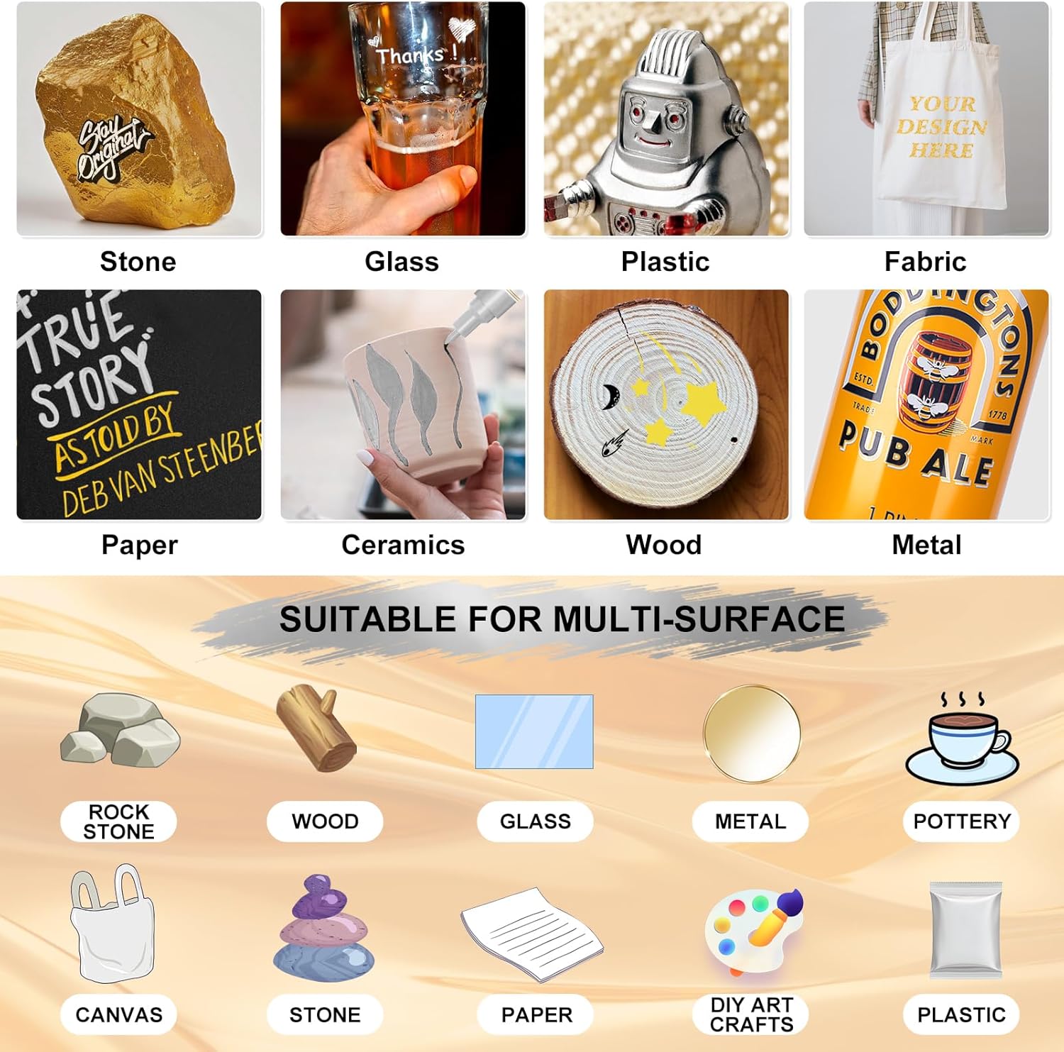 - Multi-Surface Use: This acrylic paint pen has a strong covering power, perfect for a variety of surfaces including stone, ceramic, glass, wood, fabric, metal, plastic, and more. Great for crafting, labeling, and adding creative touches to sneakers, pottery, and terracotta