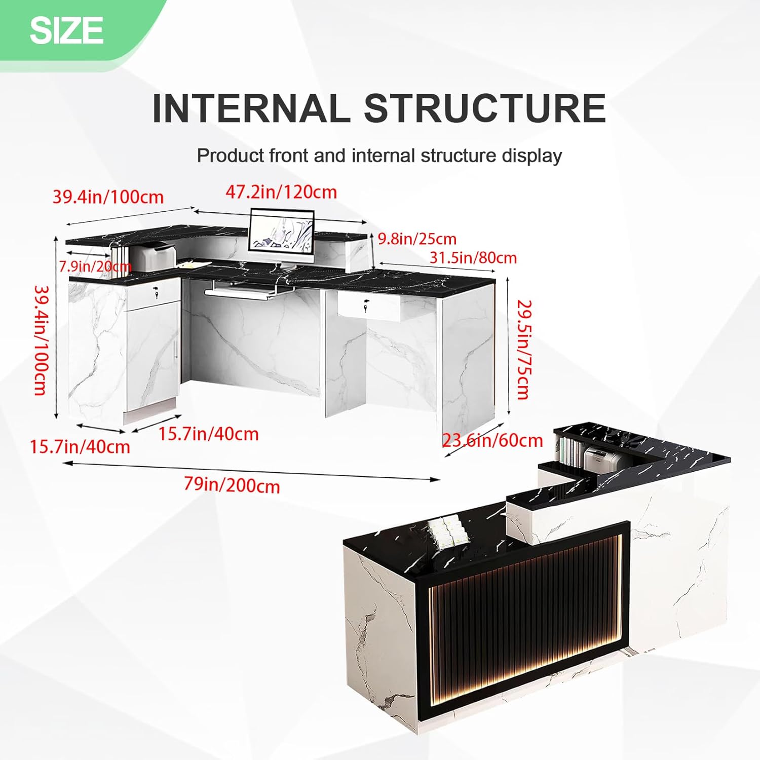 Modern Reception Desk with Counter and Drawer Office Front Desk with Cabinet Wooden Commercial Reception Table Checkout Counter for Retail Salon Lobby White and Black Right 79inch/200cm