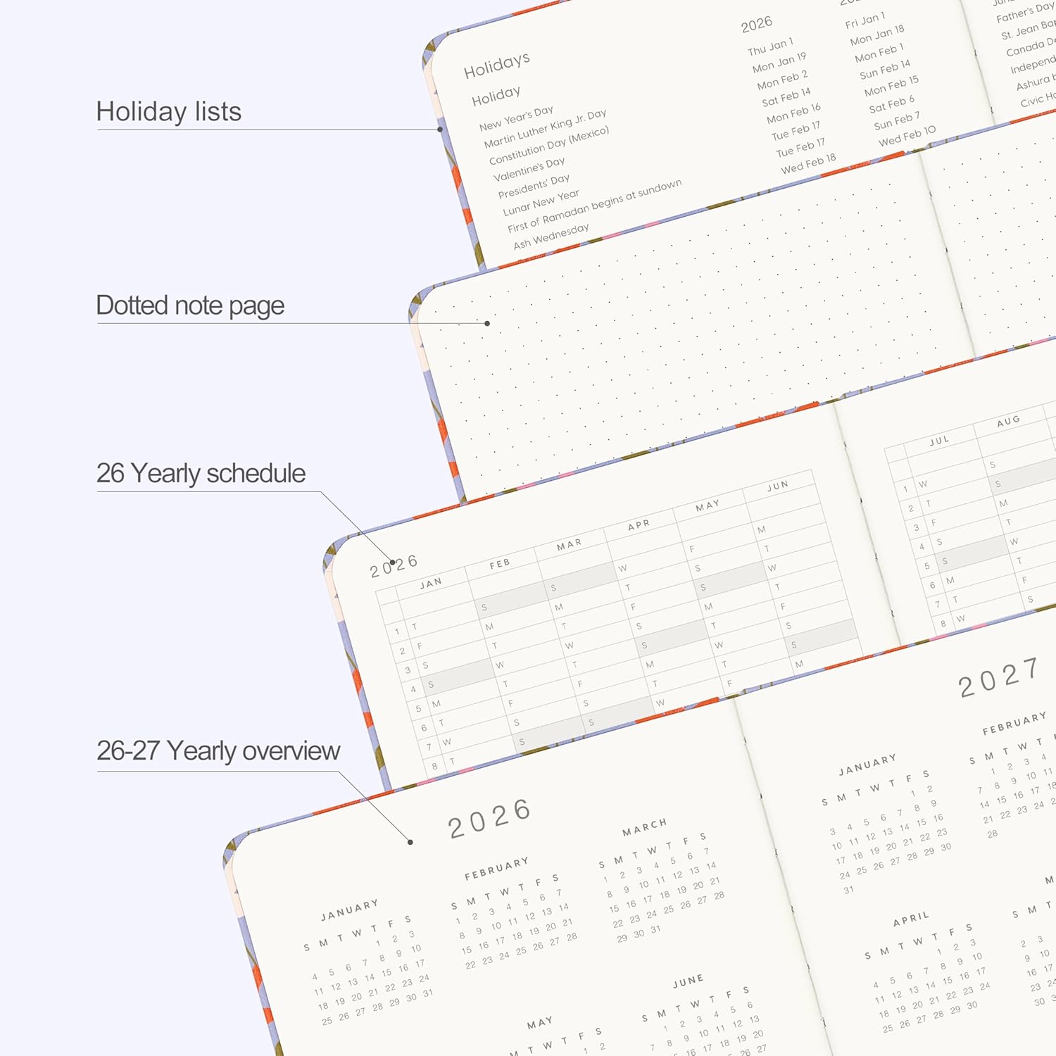 - MONTHLY OVERVIEW:Each date box provides enough writing space, including a display of holidays for each month, and the right notes row is additional planning space. 2 Ribbon bookmarks and month displays for easy navigation and lookup.