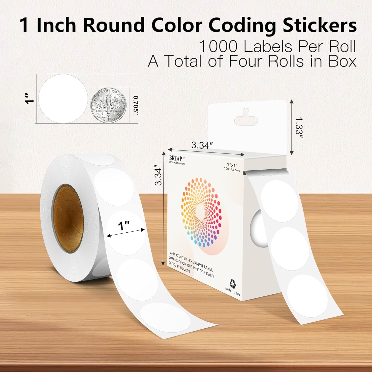 White 1 Inch Round Color Coding Labels with 4000 Dots, 4 Rolls - Bright Color Dot Stickers for File Folders, Inventory System - Highly Visible