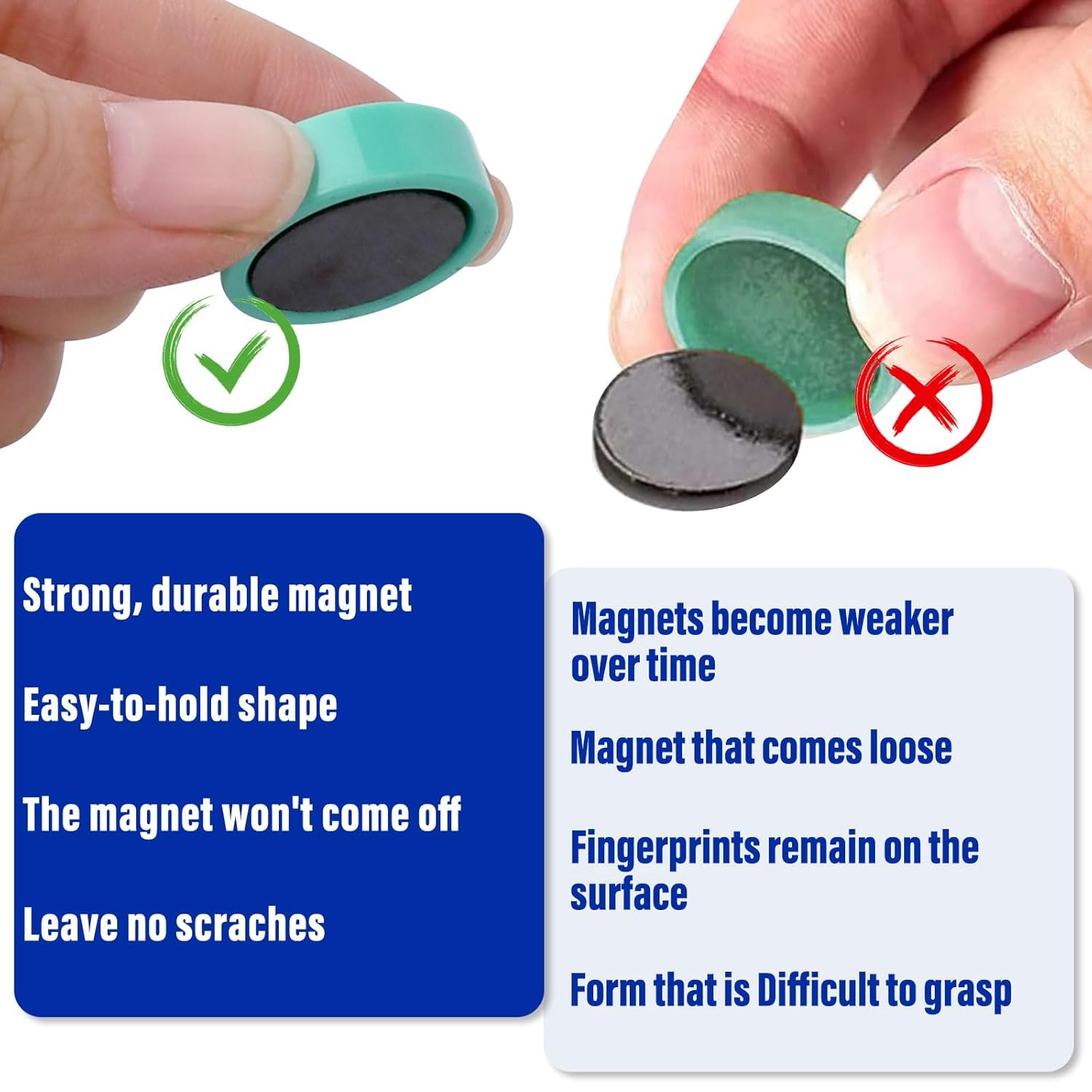 - Durable Magnet: Our strong whiteboard magnets are very durable and can be used for a long time. It has a larger magnetic contact surface that holds better and is more durable than other neodymium magnets. These small magnets are sturdy, cute, stylish and add a pop of color to your decor. Colored magnets can be used on any magnetic surface such as refrigerators, whiteboards, lockers, bulletin boards, etc. If you want to attach heavier items, be sure to use 2+ fridge magnets.