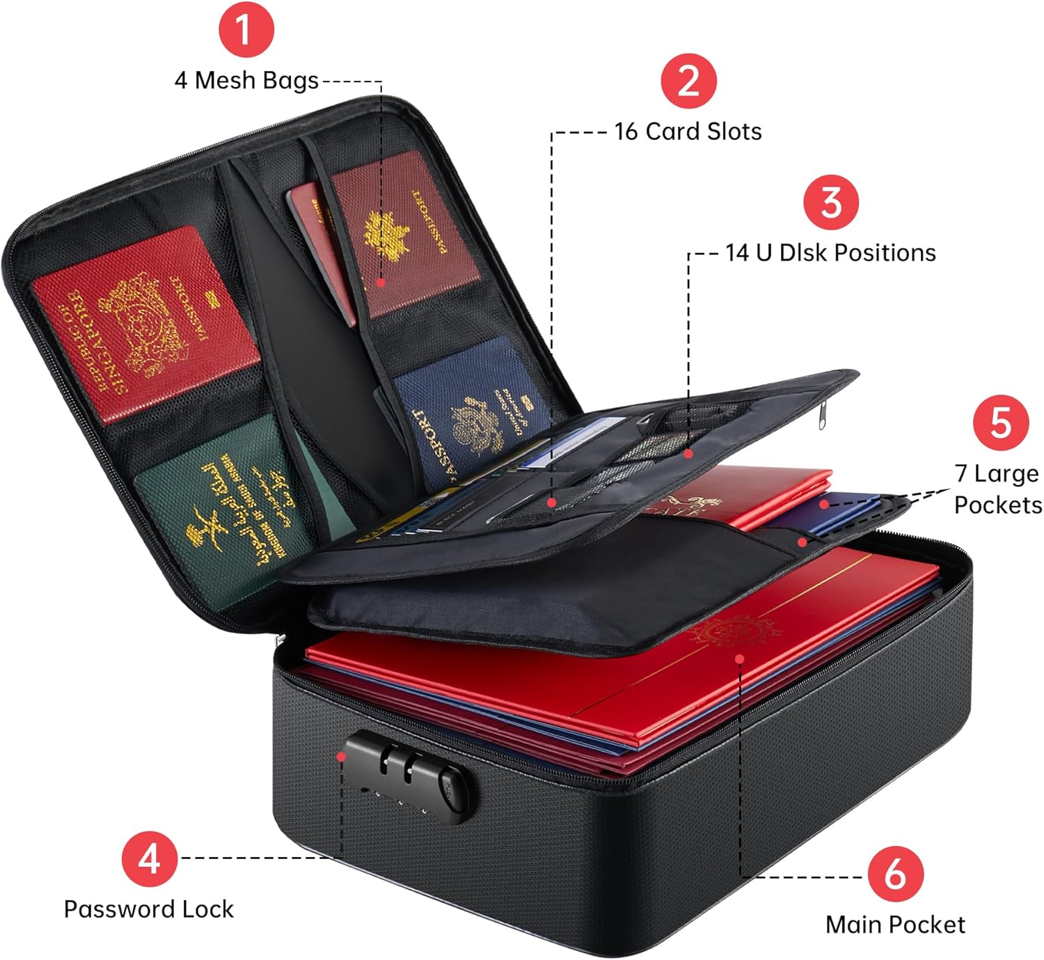 - 【Soft Box】 Large-capacity(15.1"x11.2"x4.3"),Compared with other bags,our fireproof file organizer adopts a multi-layer design that can meet all your storage needs. These include 8 passport mesh bags,16 card slots, 4 U Disk pockets, 7 folder layers and one main pocket with a large space. It can store your important documents,files,money,passport,U Disk,cards,laptop,certificates in a safe and orderly way