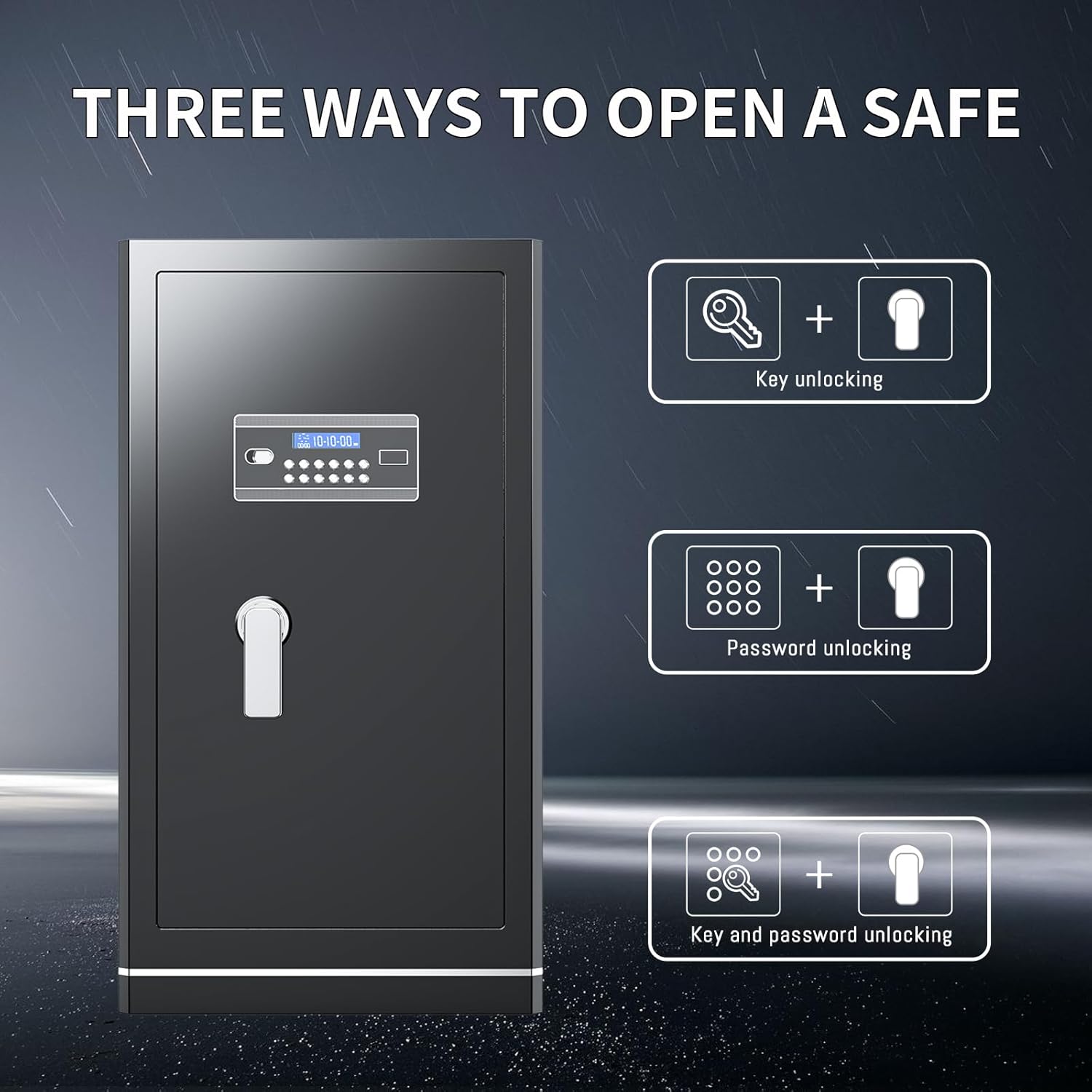 - STURDY AND DURABLE,SECURE AND ANTI-THEFT:Our home security digital safe is constructed of 5 layers of rugged cold-rolled mild steel with seamless molded construction and pry-resistant hidden hinges for long-lasting, reliable protection,and at 132 pounds,we're confident no burglar will be able to steal it. And if you want even more security protection, the peg holes in the back allow it to be secured to the wall, further preventing theft of the risks.