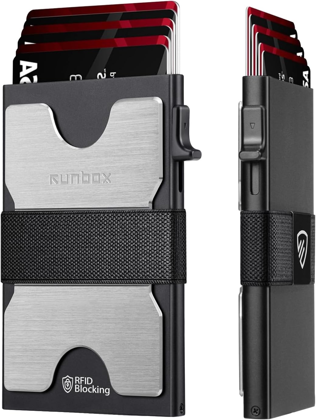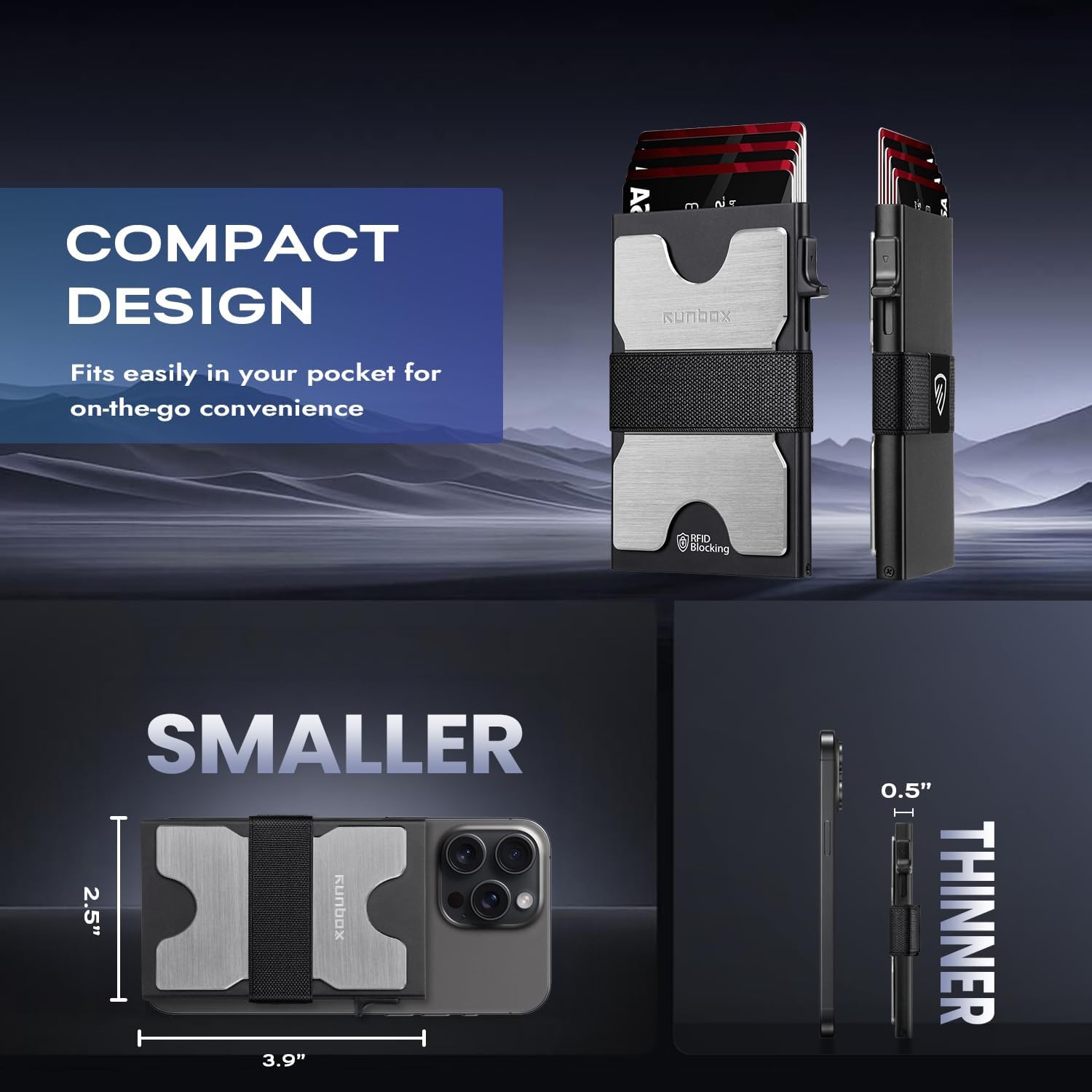 - Quick Access & Expandable Capacity (Holds 1-12 Cards): Experience effortless card access with our patented pop-up button mechanism – press to instantly eject cards. The main aluminum card holder compartment holds 4-6 cards(depending on embossed designs), while the expandable metal backplate adds 6-8 extra slots. *Total capacity varies with card thickness