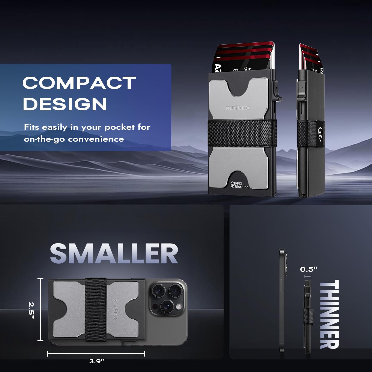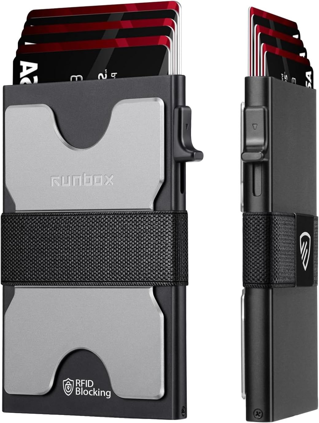 - Quick Access & Expandable Capacity (Holds 1-12 Cards): Experience effortless card access with our patented pop-up button mechanism – press to instantly eject cards. The main aluminum card holder compartment holds 4-6 cards(depending on embossed designs), while the expandable metal backplate adds 6-8 extra slots. *Total capacity varies with card thickness