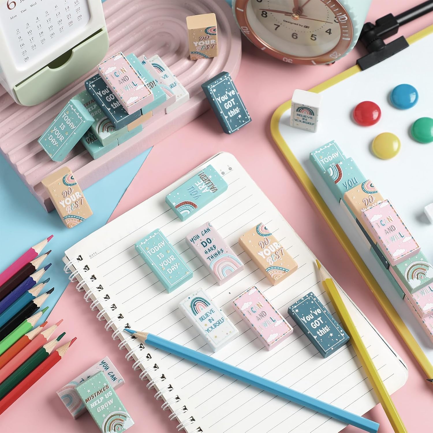 - Inspire Creativity and Motivation: these 200 pieces inspirational pencil erasers, each eraser is printed with motivational phrases, the Bohemian rainbow design and everyone is a popular copywriting design, which can inspire creativity and motivation for students and artists; Whether in the classroom or in the office, these erasers can bring positive psychological hints to users, helping them stay focused and enthusiastic