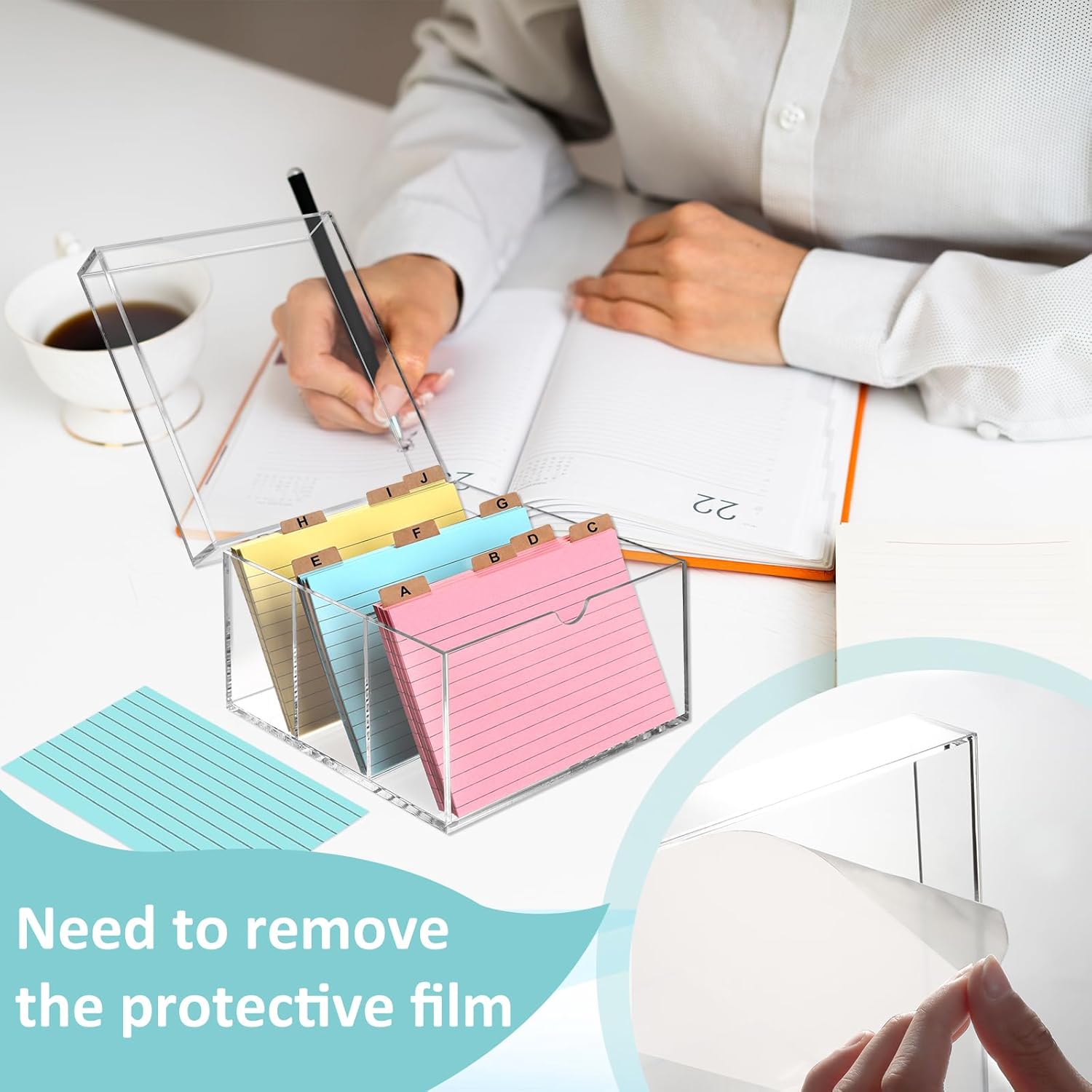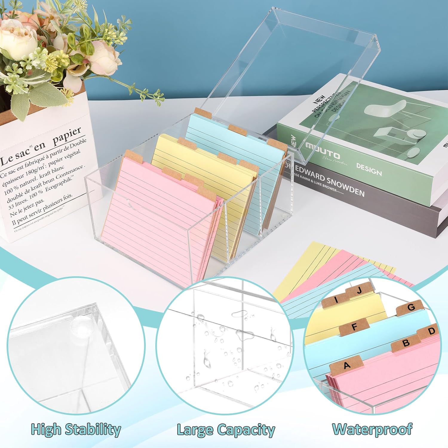 - 1. Storage at a glance: The acrylic index card holder size is 7.4x6.5x5 inches. The clear index card box is made of transparent acrylic material, which is sturdy and durable. The transparent design of the notecard box allows 360° clear viewing of the contents, allowing for clear viewing of the internal items, making it easy to organize and access. Quickly locate the items you need and say goodbye to the trouble of searching.