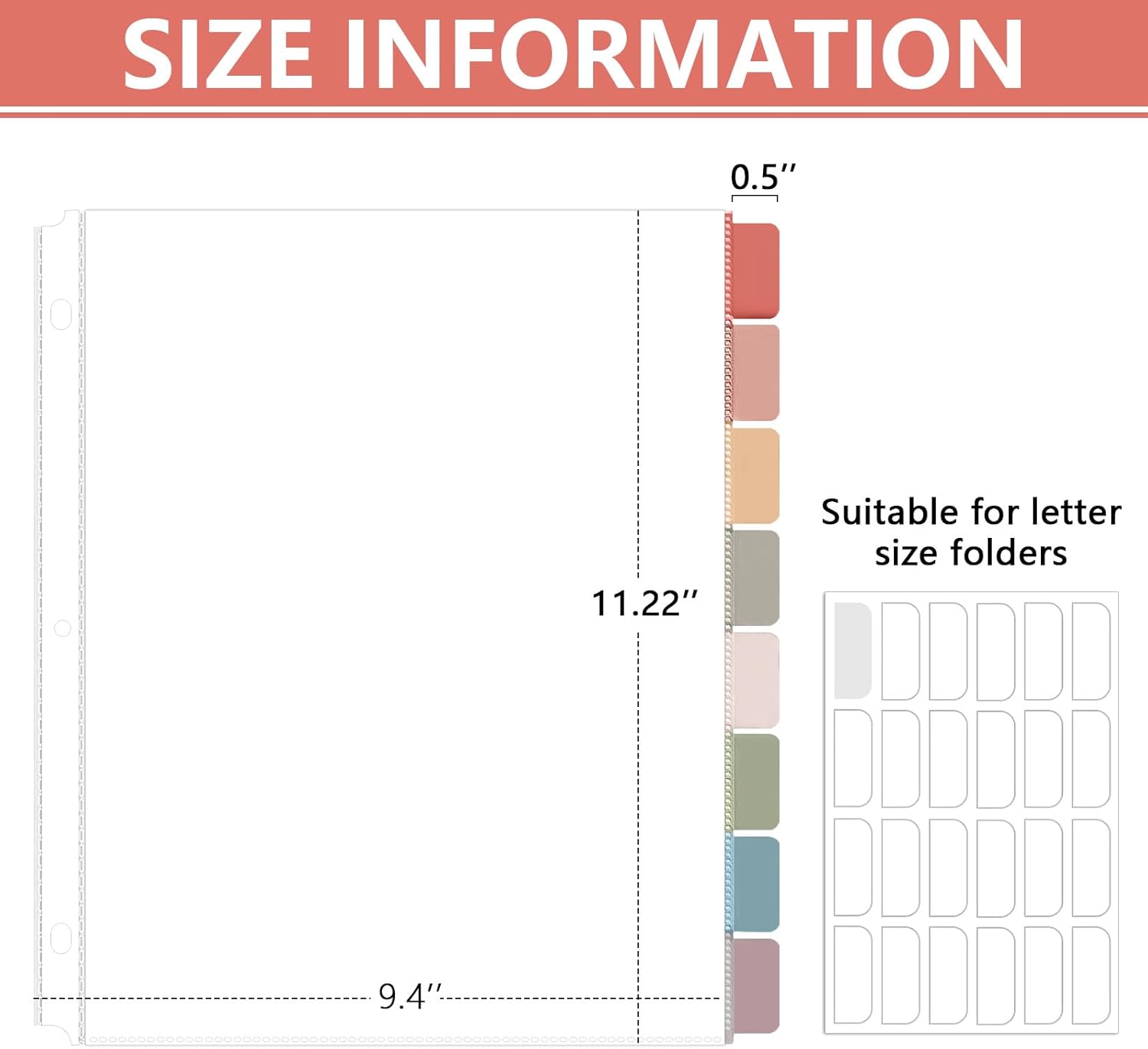 - Suitable size for standard documents: Measuring approximately 11.22 x 9.4 inches (28.5 x 32.88 cm), each tabbed divider is specifically designed to accommodate standard 8.5 x 11 inch letter-sized paper. This size is compatible with most 3-ring binders, allowing seamless integration into your existing organization system. Ideal for organizing reports, manuals, school assignments, and more.