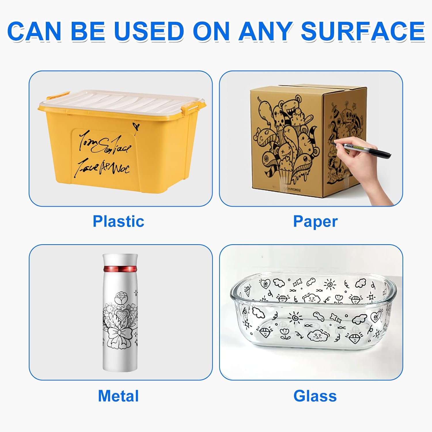 - 【Multi-functional Marker】Black permanent markers can be used not only on paper, but also on plastic, cardboard, metal, glass, ceramics, wood, fabric. The black permanent marker is widely used in office marking, factory storage labeling, educational drawing creation, daily use at home, retail merchandise marking, and food service/cold chain low temperature resistant marking and other scenarios, to meet the needs of the whole industry multi-material marking.