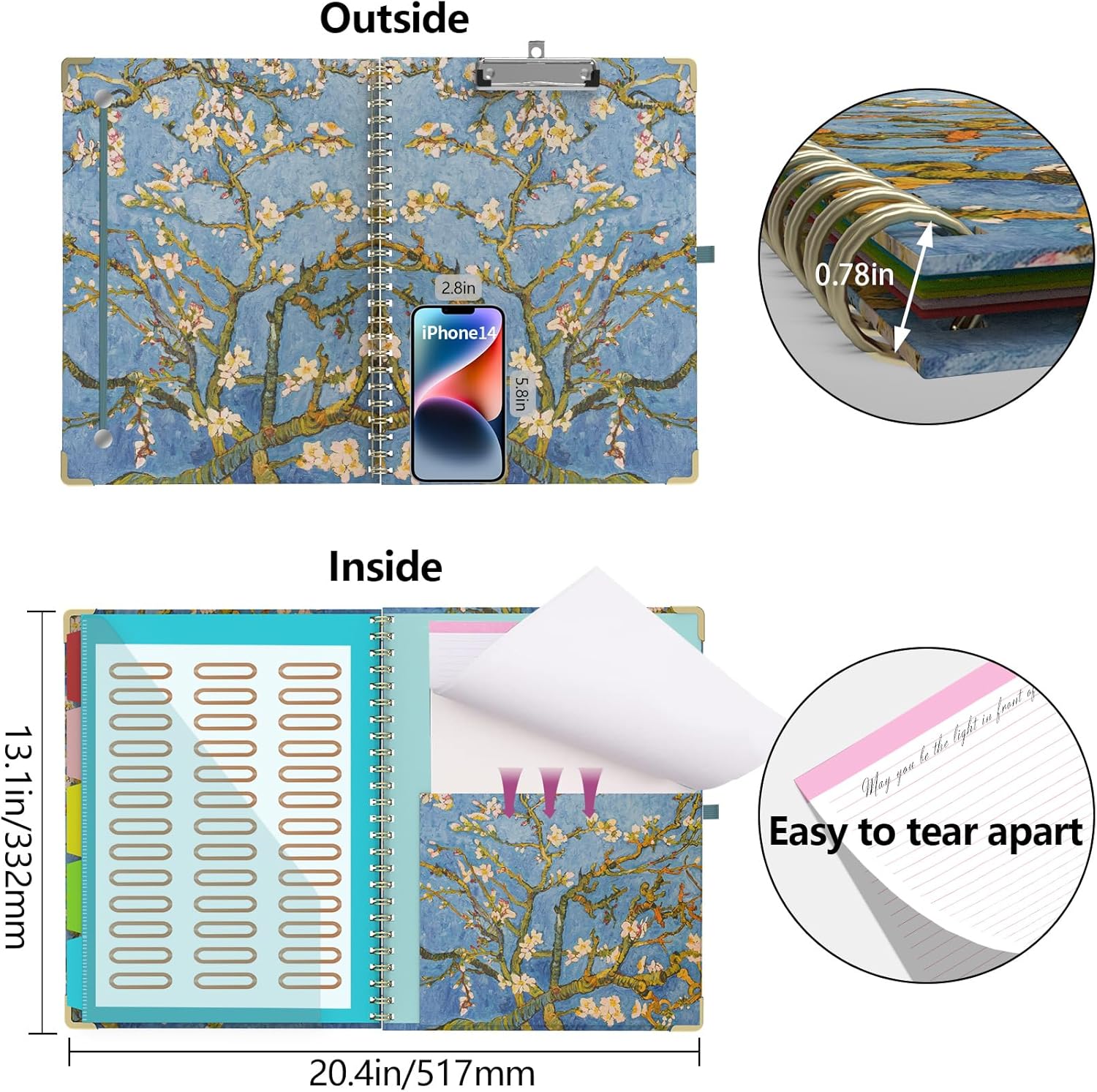 Foldable Clipboard Folio with Storage, 5 Plastic Folders with 10 Pockets,Refillable Lined Notepad (11" x 8.5"), Hardcover Project Organizer Nursing Teacher School Essentials(Almond Tree)