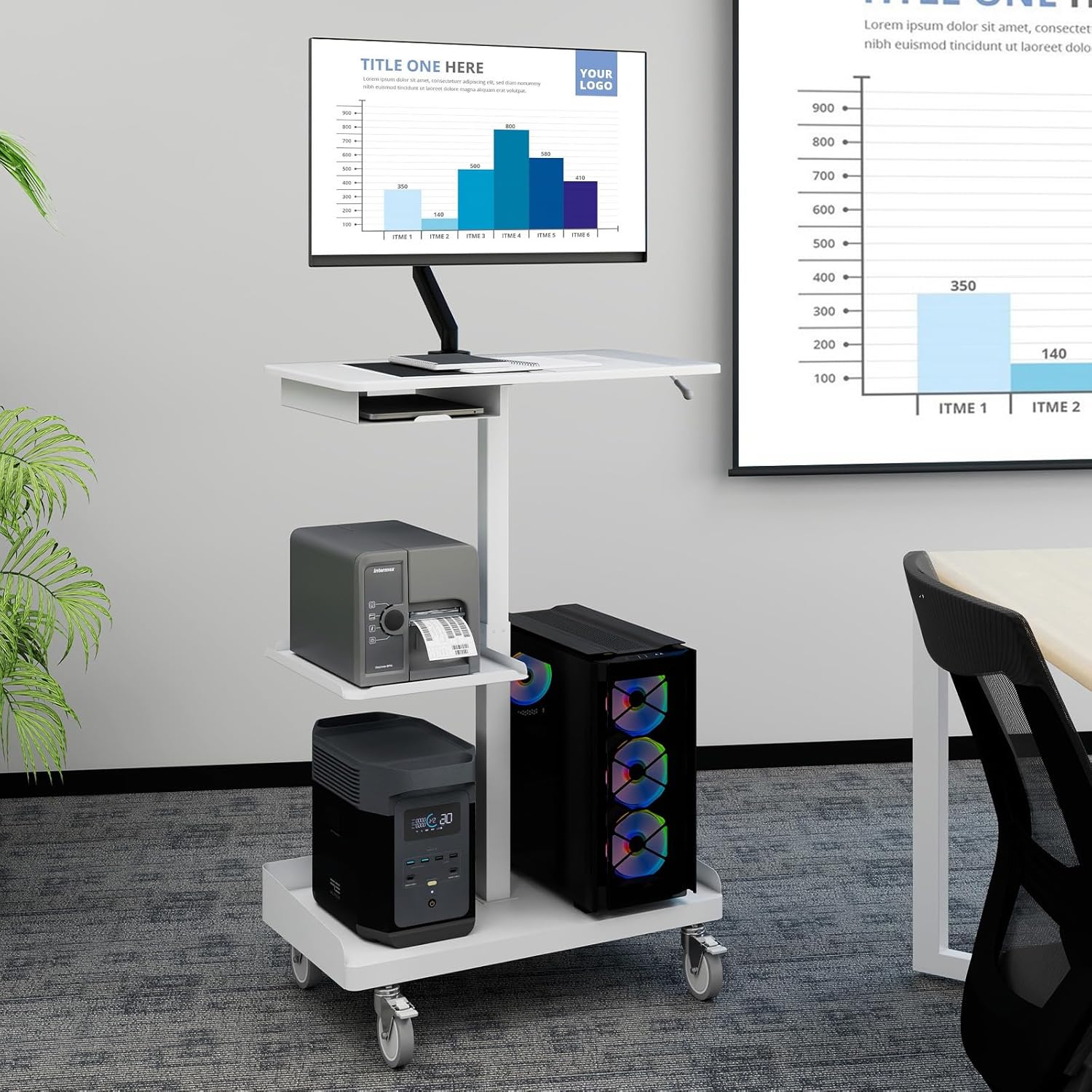 - ✅ 【Versatile Usage Scenarios】-With a built-in monitor stand and spacious storage (fits CPU, printer, power station , and laptop), this adjustable work platform serves as a multi-functional mobile workstation, such as a standing computer desk, lecture podium, medical cart, or warehouse trolley—ideal for home offices, schools, clinics, and industrial spaces.