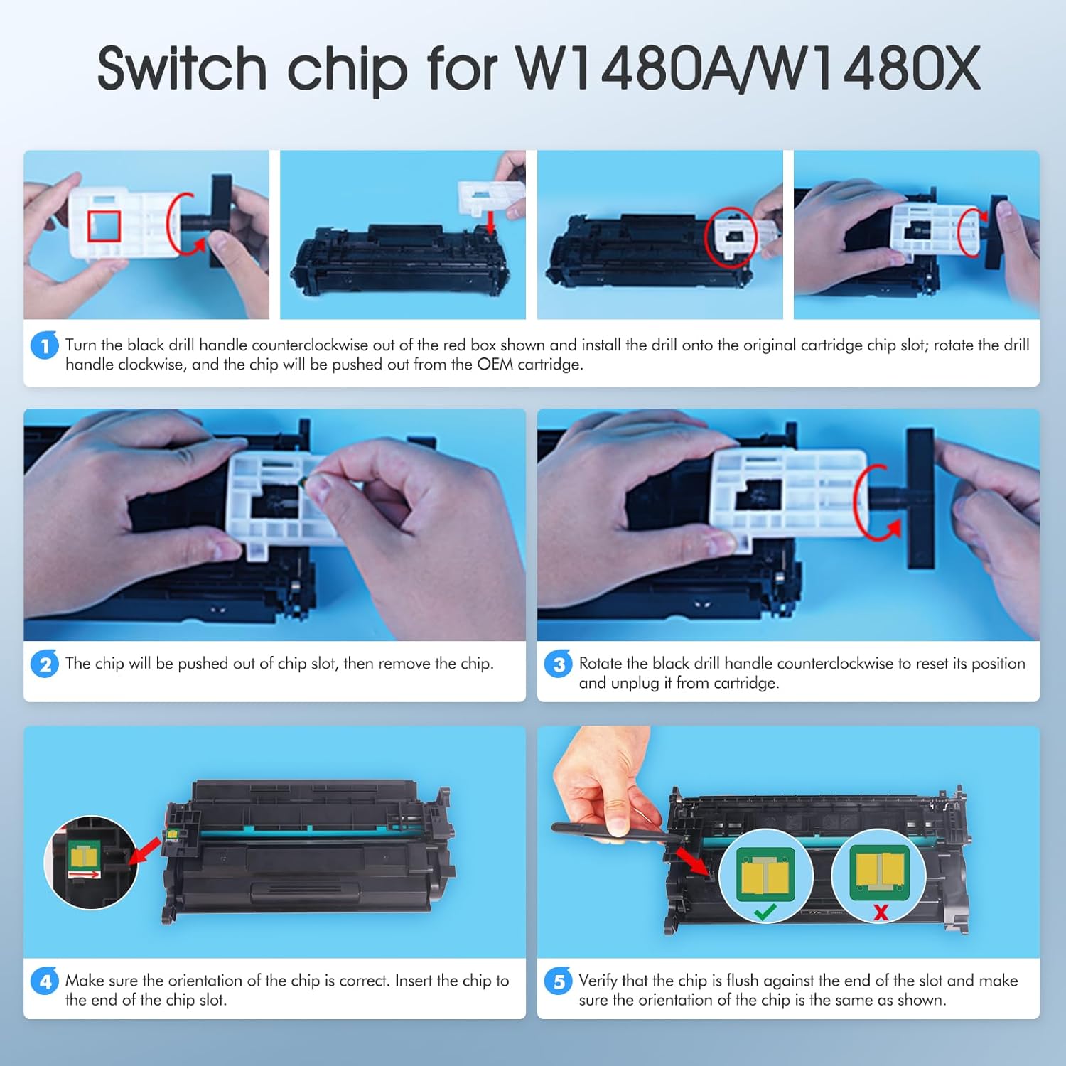 - No Chip: These 148A W1480A toner cartridges do not have chips, and need to transfer chip from 148A toner. Please follow user instructions and use the tools provided to complete the chip