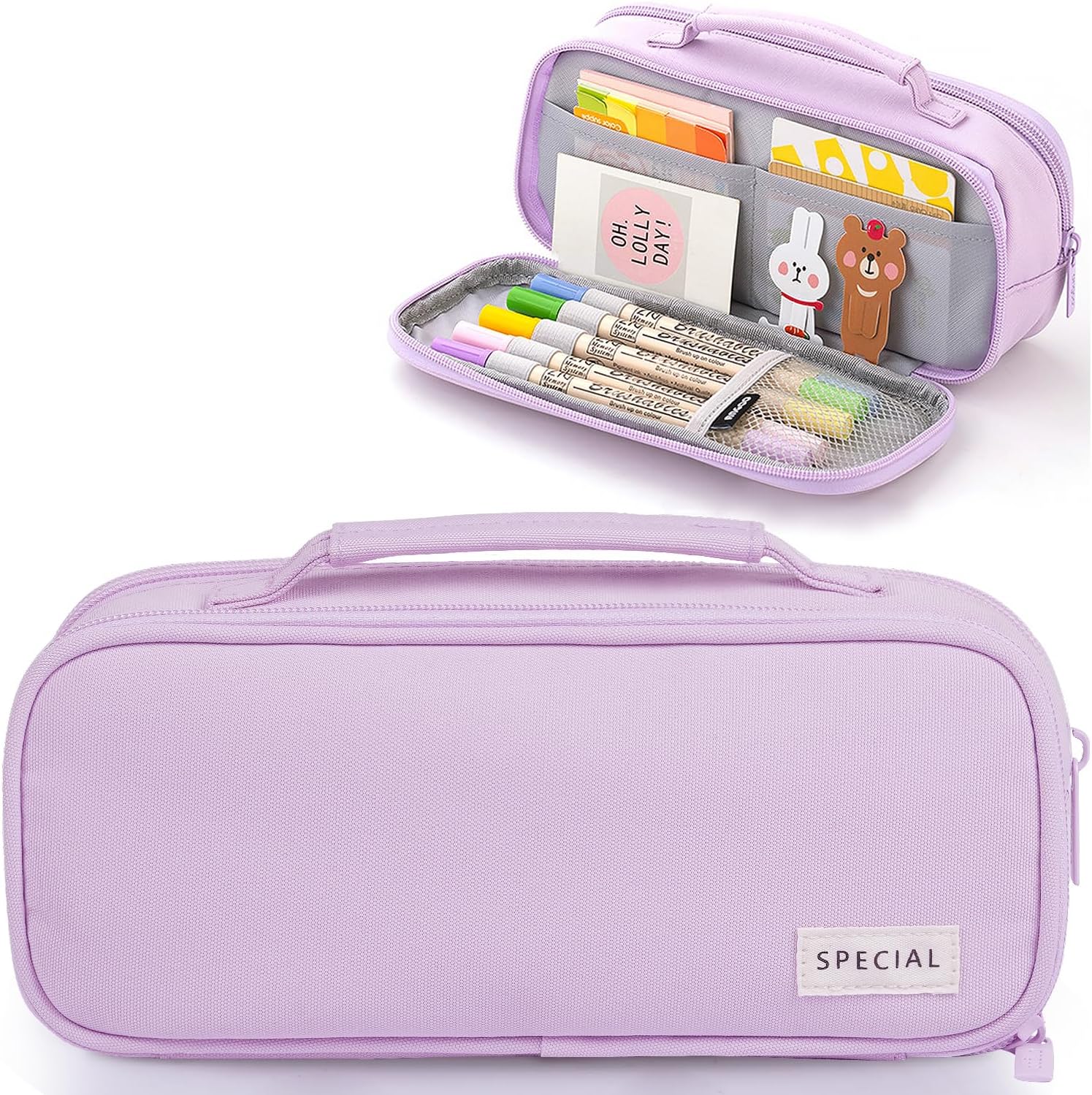 MAMUNU Pencil Case Large Capacity with 3 Compartments, Pencil Case Pouch Bag with Zipper Handle Portable Pen Stationery Organizer for Teen Girls Adults College School Office Travel, Purple