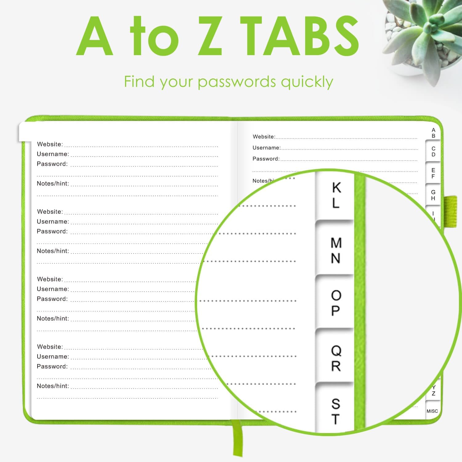 - ALPHABETICAL A-Z TABS FOR QUICK ACCESS: Alphabetical tabs design allows you to store your passwords alphabetically so you can find what you want faster, no more annoying searches!
