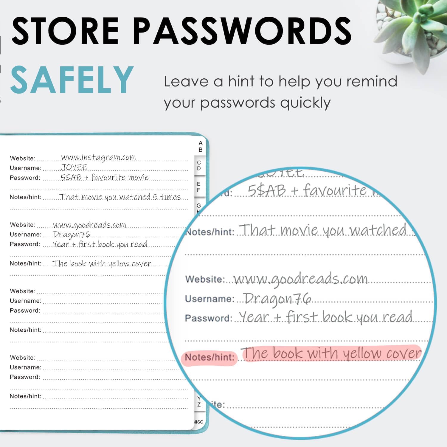 - ANONYMOUS WITHOUT ANY TITLE: On the outside, this password notebook organizer looks just like those writing journals, there is no title listed on the cover, so no one would know it's a password book. But we still recommend keeping the internet password logbook in a safe place such as a locked drawer or a shelf full of books.