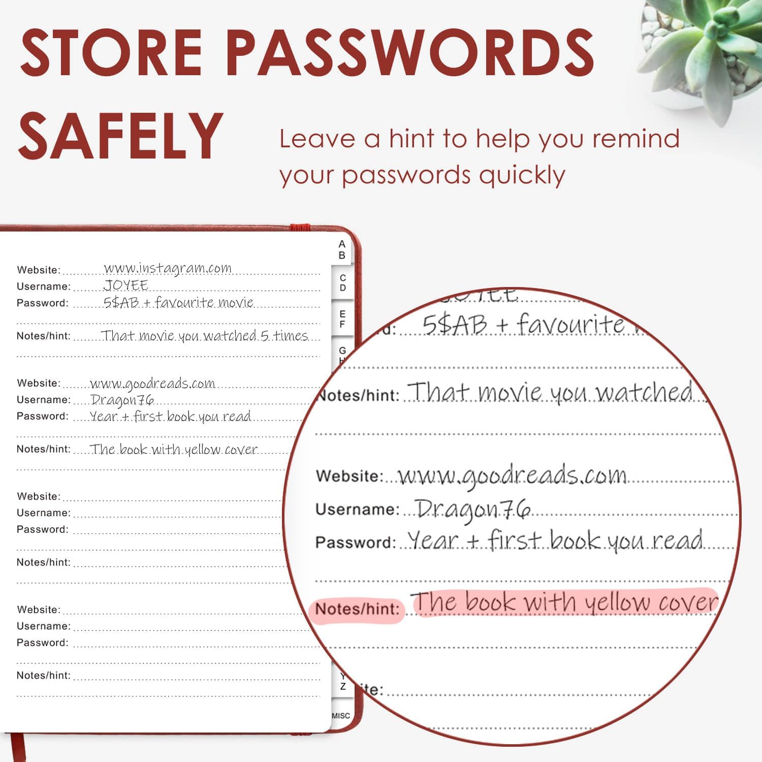 - NEVER FORGET A PASSWORD AGAIN: Almost every App. has a password, it is almost impossible to remember all the password log in details. This password book is specifically designed to help you create secure passwords and store all your passwords safely in one place. You will never forget your password log-in details again with this password keeper.