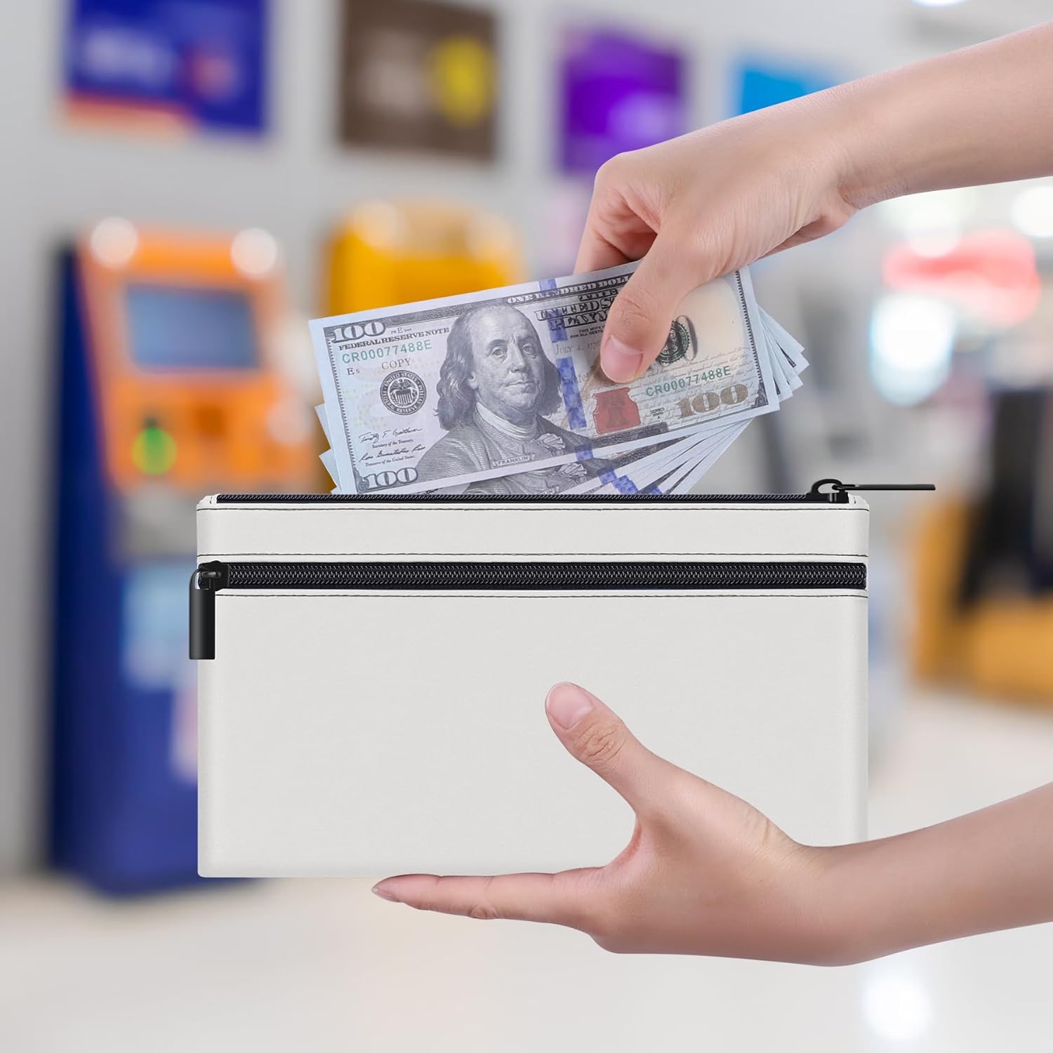 HAUTOCO 2 Pack Money Bag with Zipper 11x6.1 inch Money Pouch with Lined PU Leather Bank Bag Two Pockets Utility Wallet for Cash Check Receipt Coins Cosmetics, White