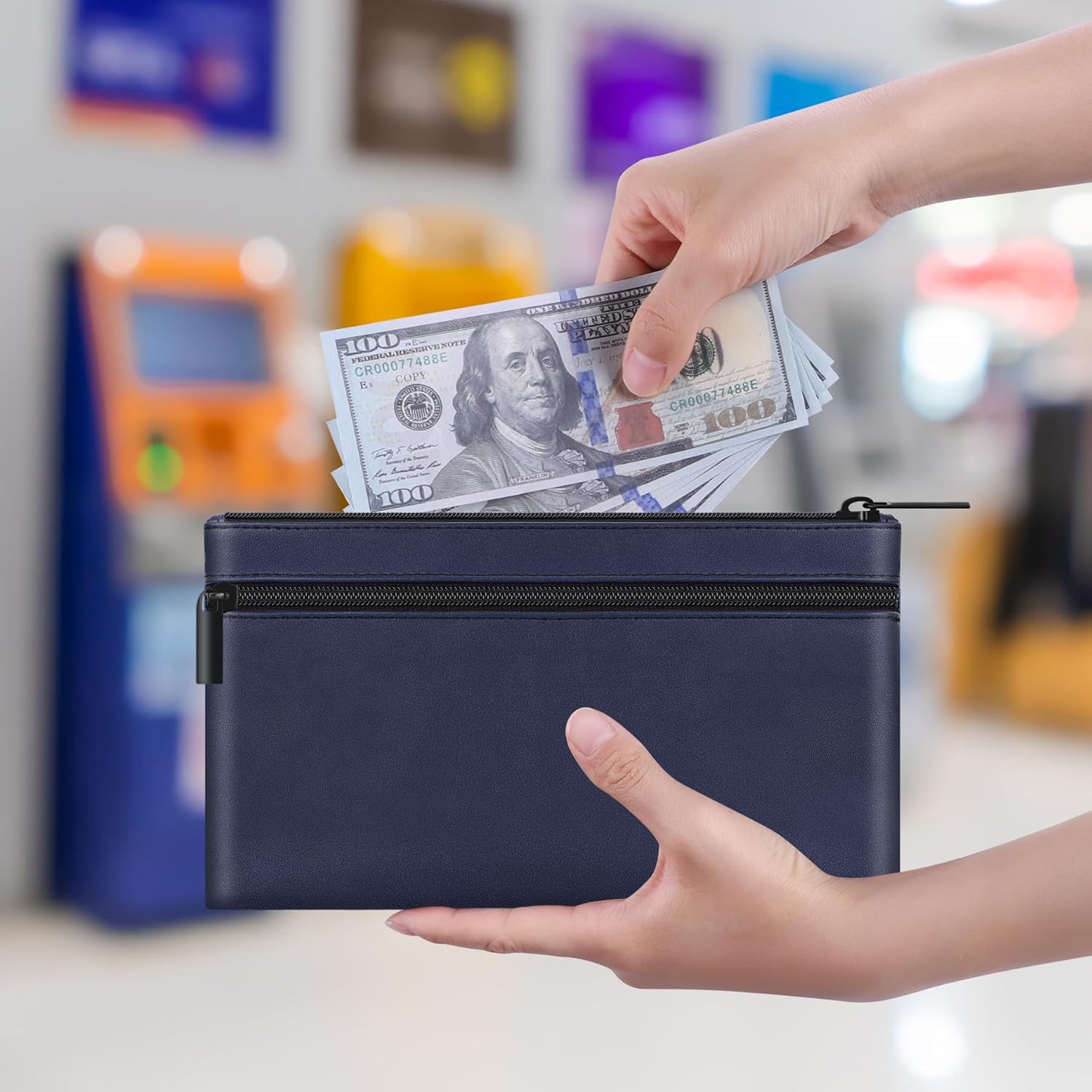 HAUTOCO Money Bag with Zipper 11x6.1 inch Money Pouch with Lined PU Leather Bank Bag Two Pockets Utility Wallet for Cash Check Receipt Coins Cosmetics, Dark Blue