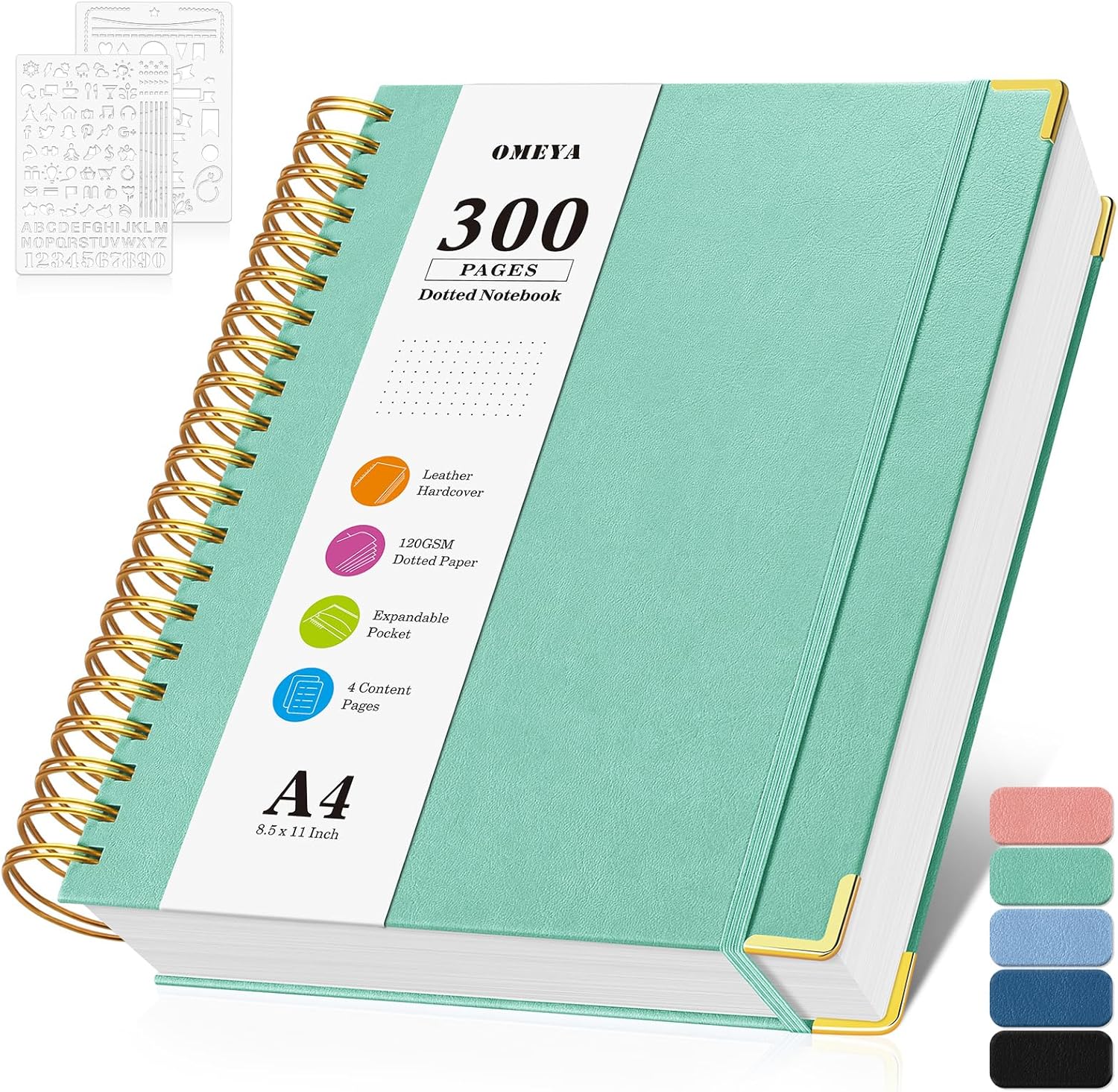 Bullet Dotted Journal Spiral Notebook, 300 Pages Leather Notebooks with Contens, 120 GSM Thick No Bleed Through Paper Journals, A4 Large Dot Grid Notebook for Women Men Work Writing, 8.5" x 11", Green