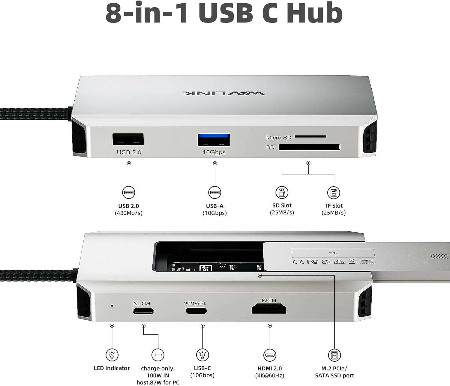- 8-in-1 USB-C Hub - This WAVLINK USB-C hub provides M.2 SSD protection, 4K HDMI, 10Gbps USB-A&C, USB-C PD input, SD & TF card slots, and USB-A 2.0 for wireless devices. One USB-C hub - all the features you need!