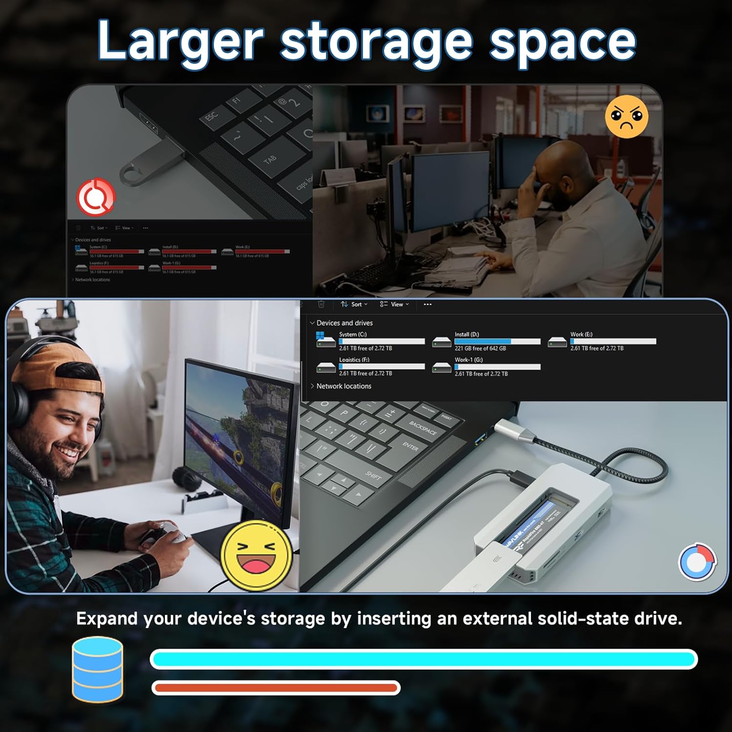 - USB-C Hub with SSD Port - What to do if your laptop's memory is not enough? Installing an SSD is too cumbersome for a laptop? Then try our USB-C hub with SSD connection! It supports up to 10Gbps M.2 PCIe SSD (M-Key/B&M Key) and 6Gbps M.2 SATA (B&M Key) with 4TB capacity. Expand your computer memory as you like – just use it!