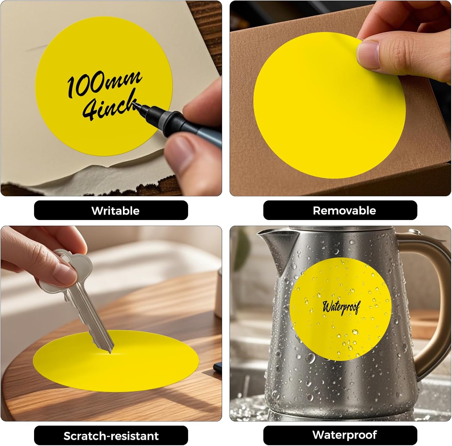 - Premium Quality: Round labels can stick on most flat and smooth surfaces such as paper, plastic, cardboard, glass and metal. The labels are not easily scratched and torn when used.