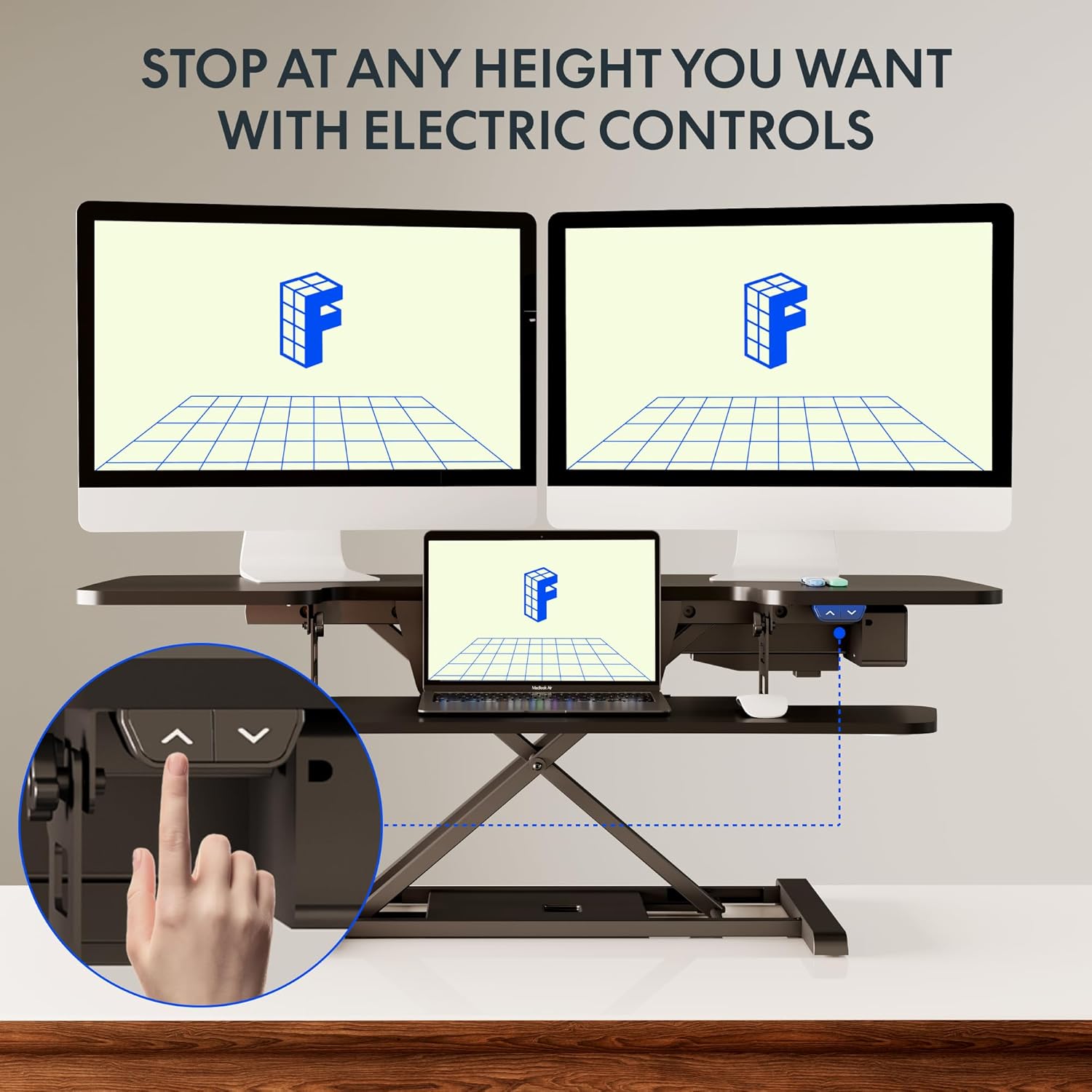 - Smooth & Quiet Electric Lift – Enjoy whisper-quiet operation with our advanced motorized standing desk converter, designed for smooth, effortless height adjustments (5.7"–19.7"). The intuitive one-touch control panel makes it easy to find your perfect ergonomic position—just press a button and glide into place.