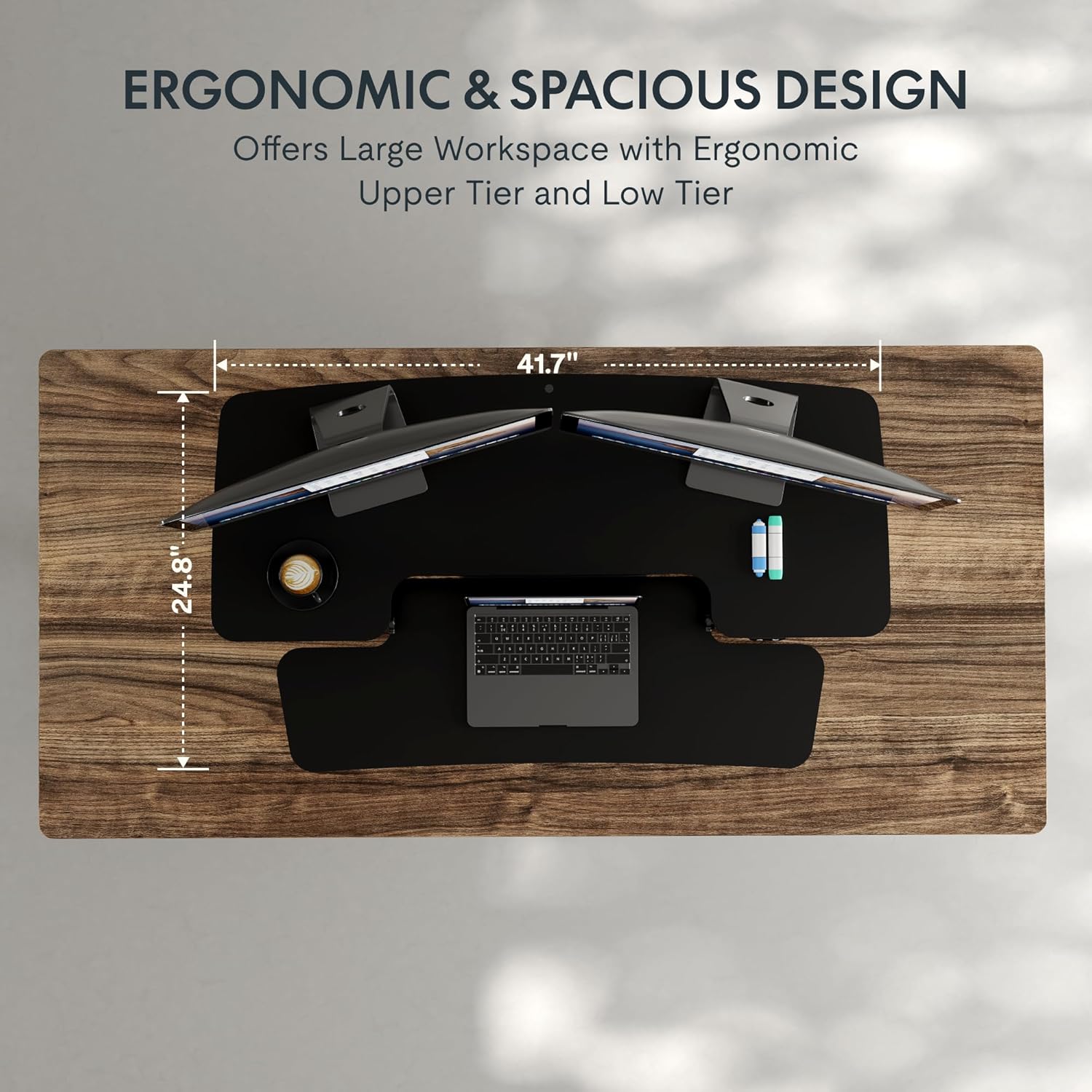 - True Ergonomic Relief – Say goodbye to back, neck, and wrist pain! This desk riser for standing promotes healthy posture with smooth, controlled transitions between sitting and standing, reducing fatigue and keeping you comfortable for hours.