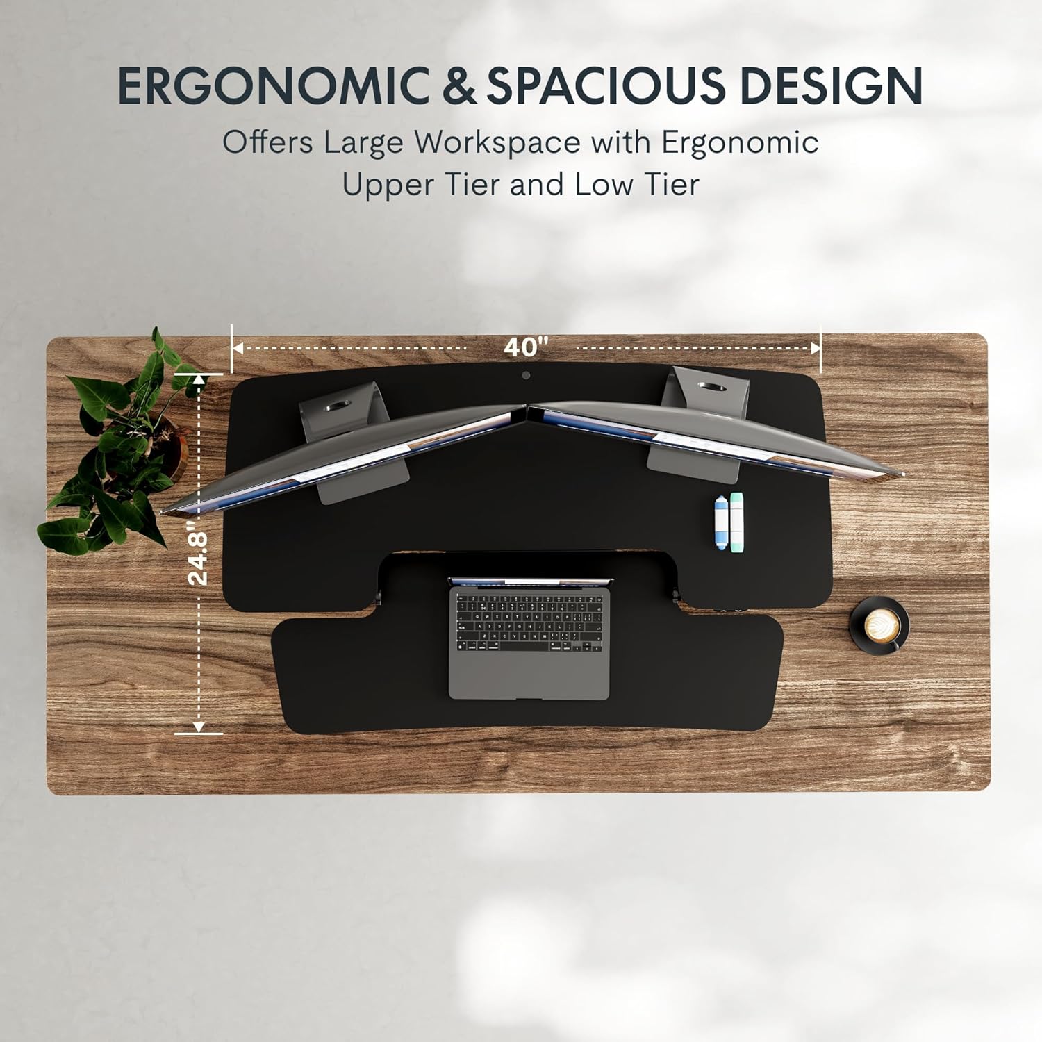 - True Ergonomic Relief – Say goodbye to back, neck, and wrist pain! This desk riser for standing promotes healthy posture with smooth, controlled transitions between sitting and standing, reducing fatigue and keeping you comfortable for hours.