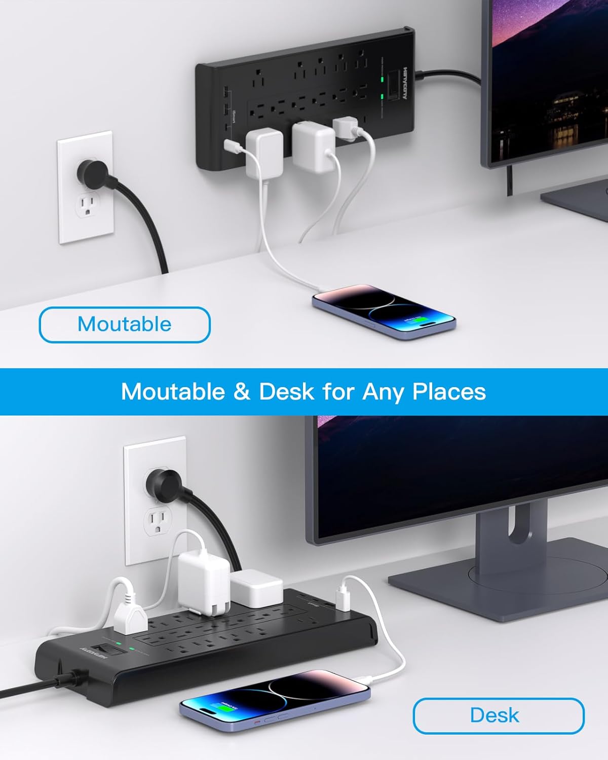 - Special Feature : 10 Ft Long Extension Cord, 2700J Surge Protection, Mountable, On And Off Switch, Usb C Slot