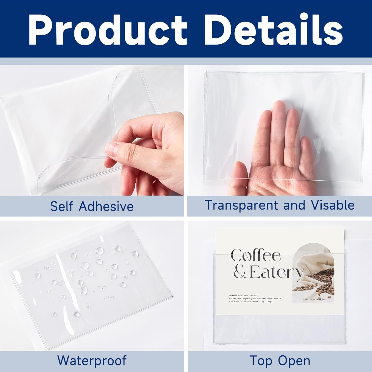 - Self-adhesive Backing: Each plastic card sleeve has self-adhesive glue on the back, which can be firmly pasted on any surface, no need other tools, such as plastic, cardboard, metal, wooden, paper and more
