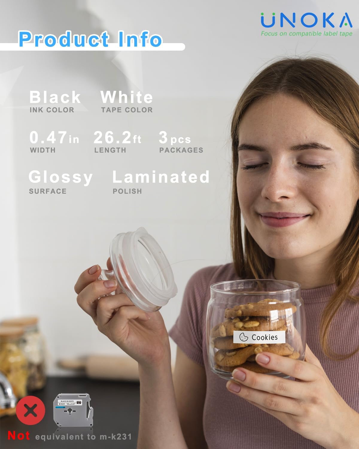 UNOKA Ptouch Tape 12mm 0.47 White Laminated Compatible with Brother Label Maker PTH110 PTD220 PTD210, TZe TZ Tape TZe-231 Black Ink on White Refills, Waterproof, Indoor/Outdoor Use, 2 Pack
