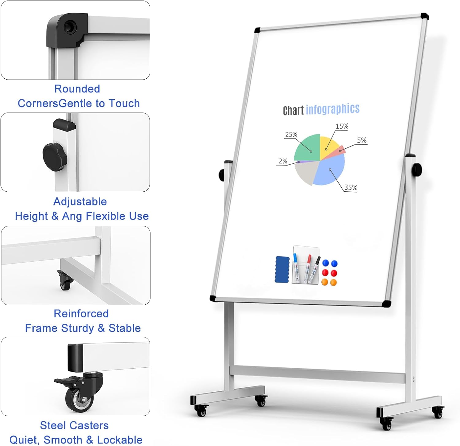 - Double-Sided Magnetic Surface: Maximize productivity with this double-sided magnetic dry erase board that rotates effortlessly and locks firmly. Both sides provide a smooth, magnetic surface—ideal for planning, teaching, drawing, or presentations. Use magnets to attach notes, diagrams, and documents securely.