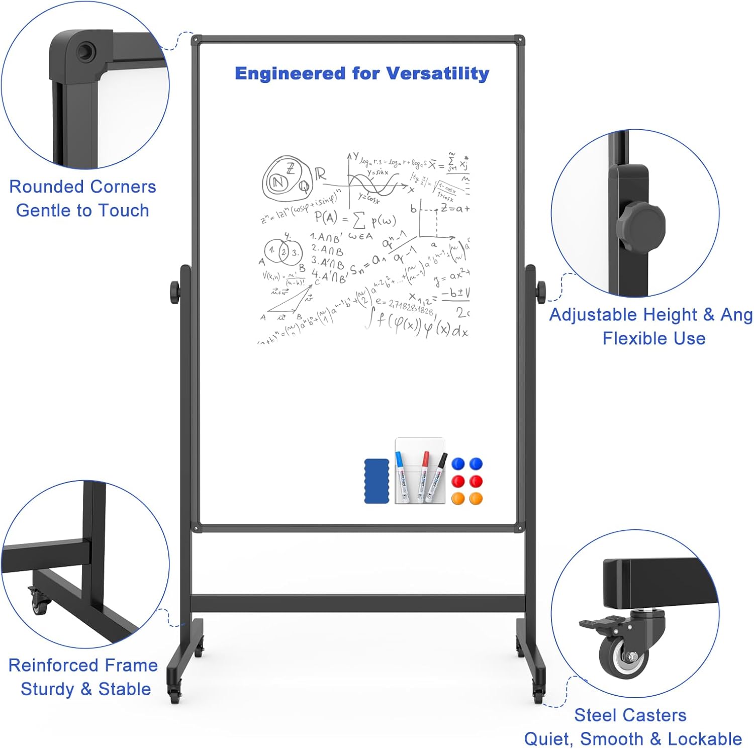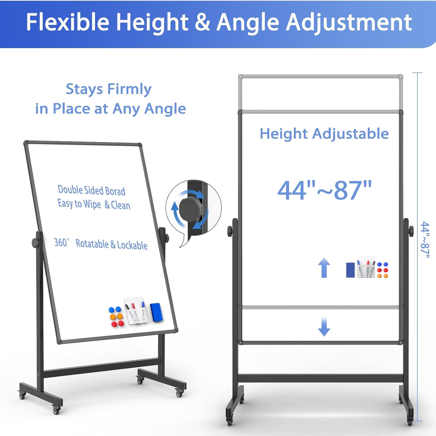 - Height Adjustable Rolling Whiteboard for All Users: This height adjustable whiteboard on wheels extends from 44" to 87" with a simple twist knob—no tools or disassembly required. Whether standing or seated, adults and teens can use this mobile dry erase board comfortably in classrooms, offices, or shared spaces.