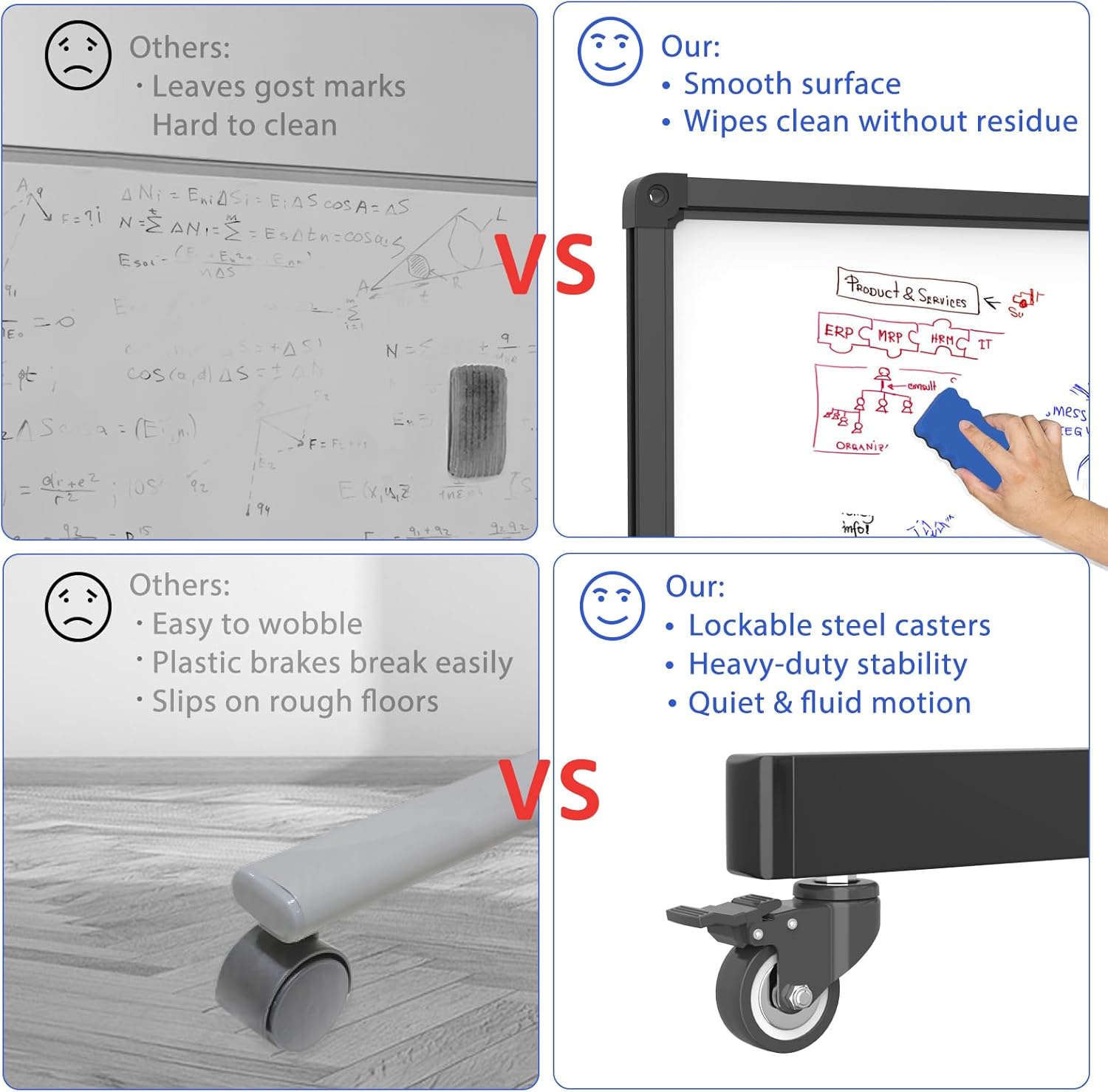 - Stable Mobile Whiteboard with Lockable Steel Wheels: Built with integrated welded steel columns and a reinforced crossbar, this rolling whiteboard ensures long-lasting stability. Four 360° steel caster wheels offer smooth, quiet movement and dual locking brakes, keeping the magnetic whiteboard firmly in place on wood, tile, or carpet.