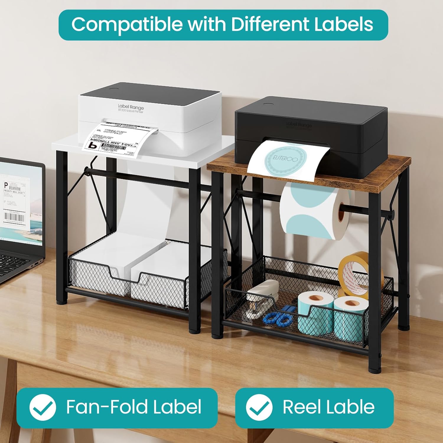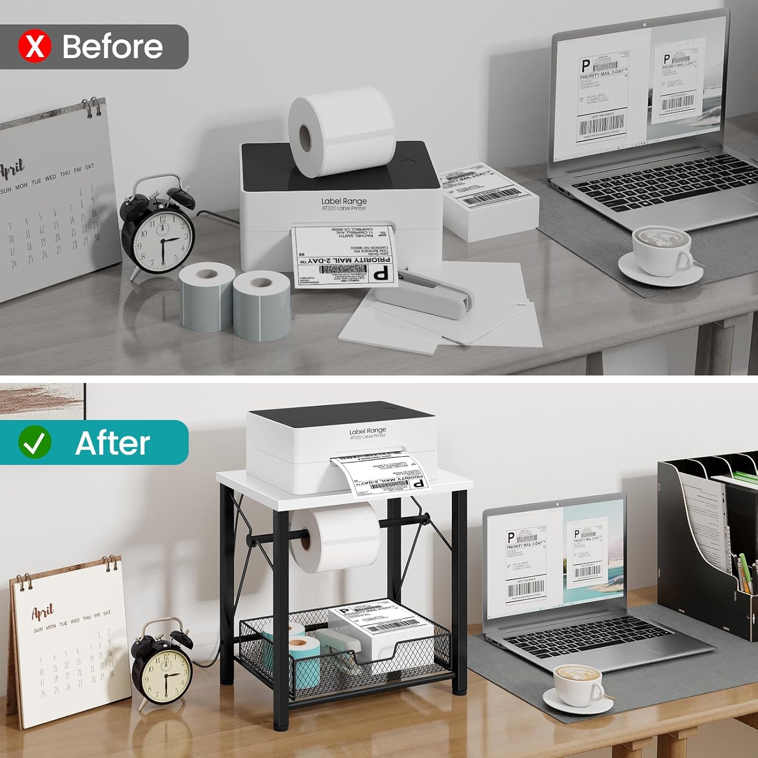 - 【All-in-One Label Holder with Drawer】 This label holder is designed to efficiently store both printers and labels, maximizing workspace organization. The top layer holds the printer, while the lower section features a wooden pole for label rolls and a bottom drawer for extra office supplies. A perfect space-saving solution for an organized and clutter-free desk.