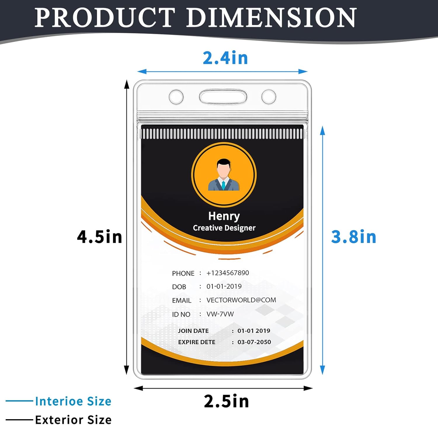 - Waterproof & Dust-proof - Our plastic name tag ID holder is made of quality PVC material, which is durable, not easy to wear, with resealable zipper closure and 2 convex points. Good sealing can prevent water or dust from entering, keeping cards dry and clean. You can safely put your ID card, work card, traffic pass, or credit card in it.