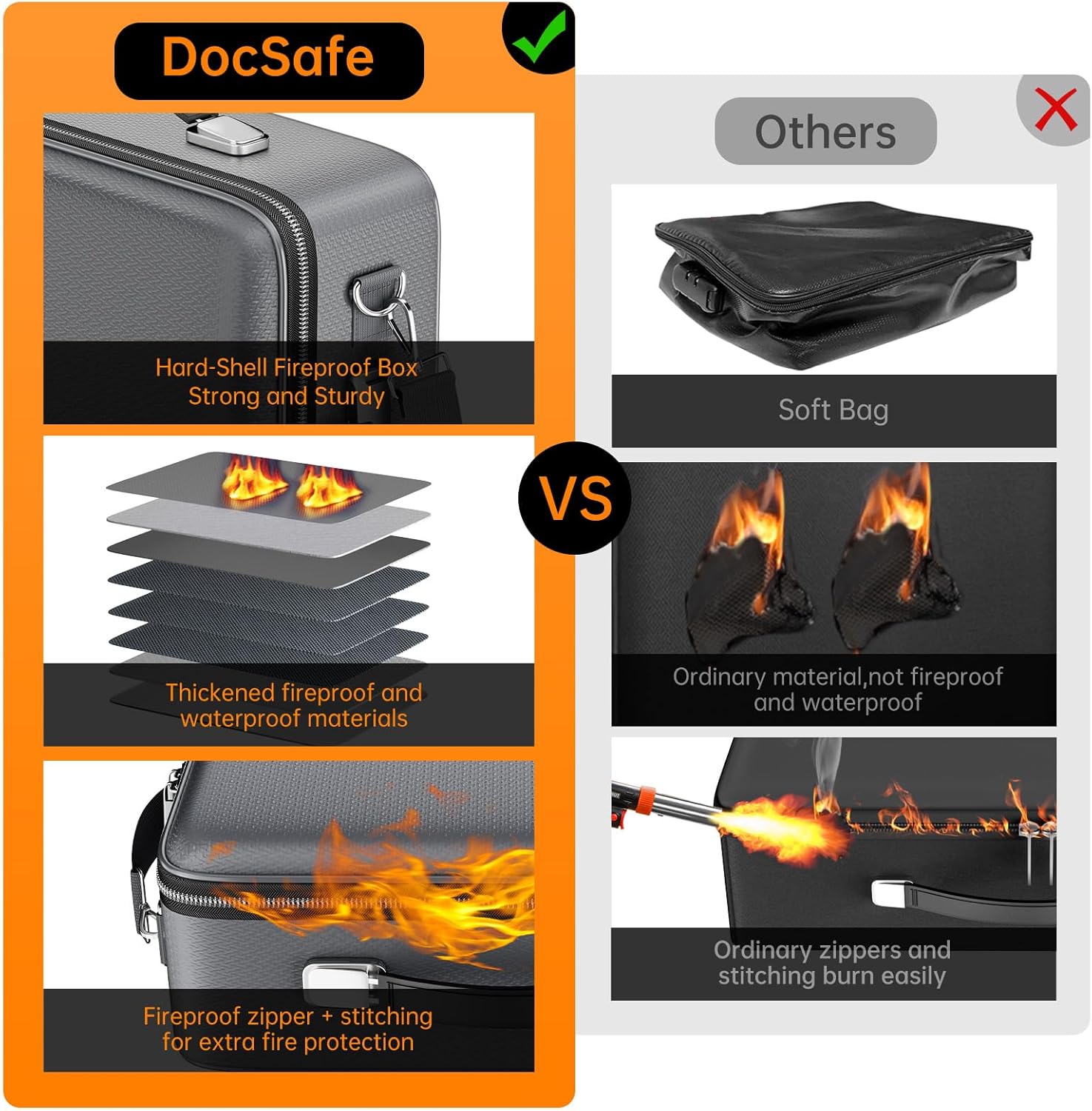 - Ultimate Fireproof & Water-Resistant Protection: Keep your valuables safe with our Hard-Shell fireproof document box. It is made of thickened silicone coated fireproof heat insulated cotton material and hard-shell material which can stands up against fire and passed the SGS TEST(UL-94 VTM-0 Burning Test). The upgraded fireproof metal zipper is made of high-strength metal teeth and fireproof stitching, which can effectively block the flame and completely protect the documents from being damaged