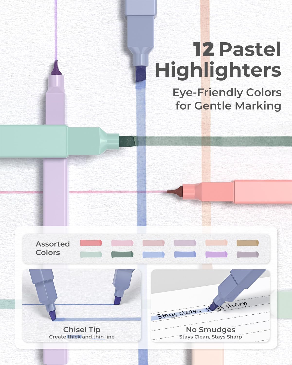 - 12 Assorted Colors Highlighters: Ideal for book annotation and Bible study, these no bleed markers feature eye-friendly pastel colors and a dual-tip chisel design for both precision and broad highlighting; The quick-drying ink prevents smudging while keeping pages clean and crisp for textbooks and planners