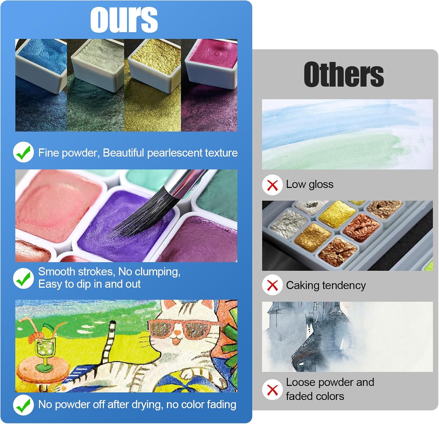 - 【Smooth Strokes, No Powder Off After Drying】: Our watercolor paints are fine powder with smooth strokes that won't clump. The powder will not fall off after drying, making the artwork shine forever