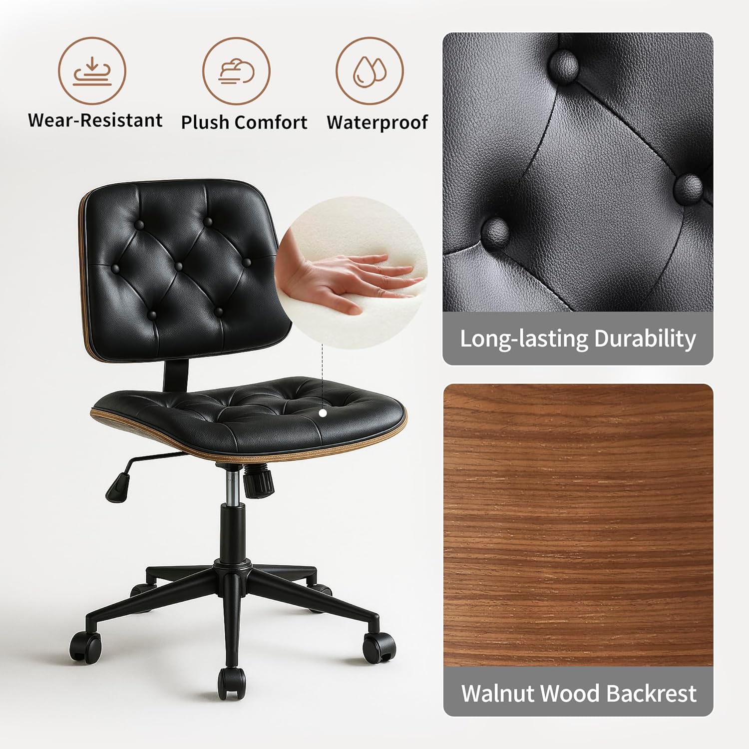 Small Home Office Chair – Armless Mid-Back Desk Chair with PU Leather, Adjustable Height, Swivel Wheels, Modern Walnut Legs for Small Spaces, Black