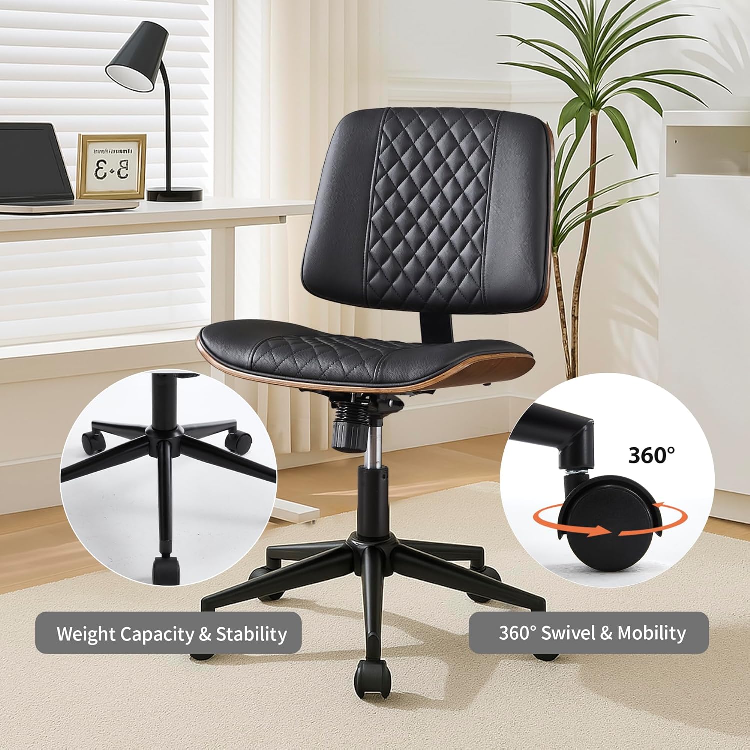 Modern Black Home Office Chair – Armless Mid-Back Desk Chair with PU Leather, Adjustable Height, Swivel Wheels, Walnut Wood Finish, Perfect for Small Spaces