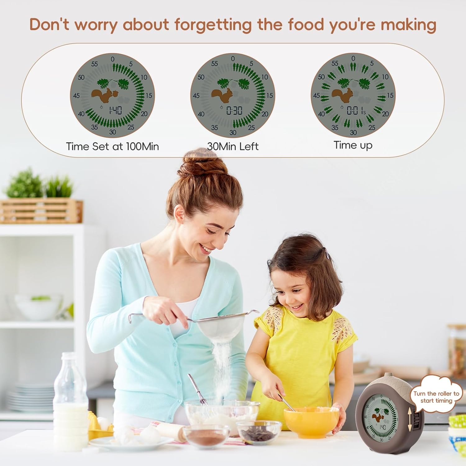 - Easy Timing: Just roll the wheel on the side of the timers to set the time. You can set the timer up to 299 minutes! Once the timer is set, you can focus on completing the task. The countdown will automatically notify you when it's time to finish