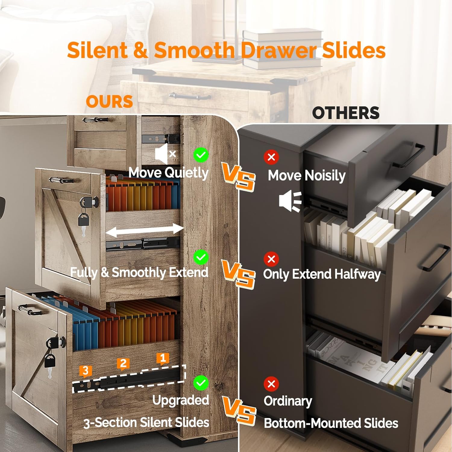 - 【Silent Sliding Perfection】The three-section slides ensure the drawers extend fully and smoothly, without a hint of noise, making it convenient for you to search for and access your file folders.