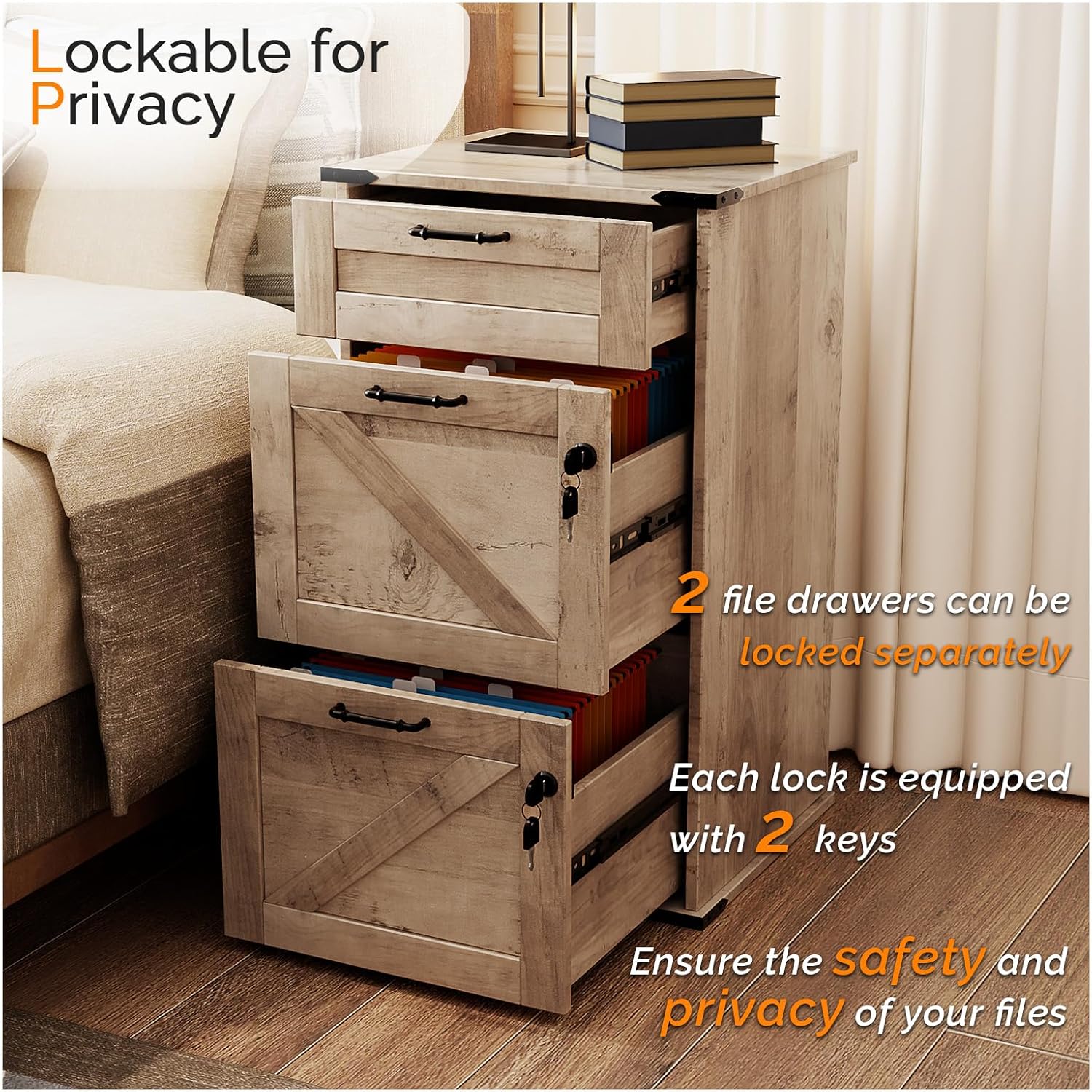 - 【Lockable for Privacy】The 2 large drawers for hanging folders can be independently locked, and each lock is accompanied by 2 keys for added security.